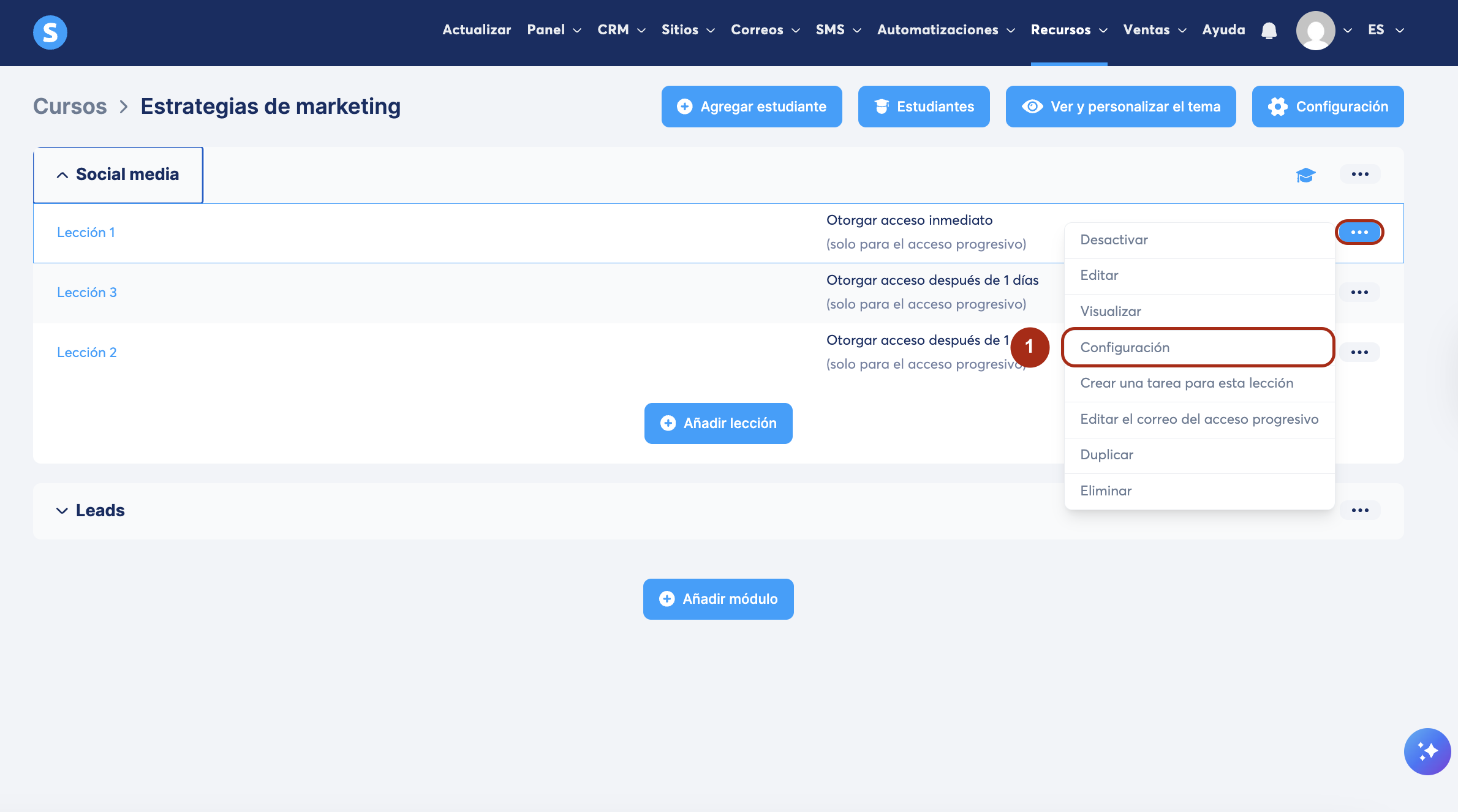Para agregar la sección de comentarios a una lección, abre al curso para ver la lista de módulos y lecciones. En la lección donde quieras agregar la sección de comentarios, haz clic en Configuración (1).