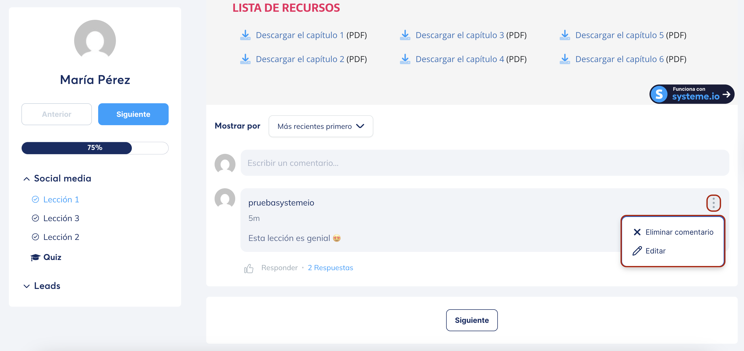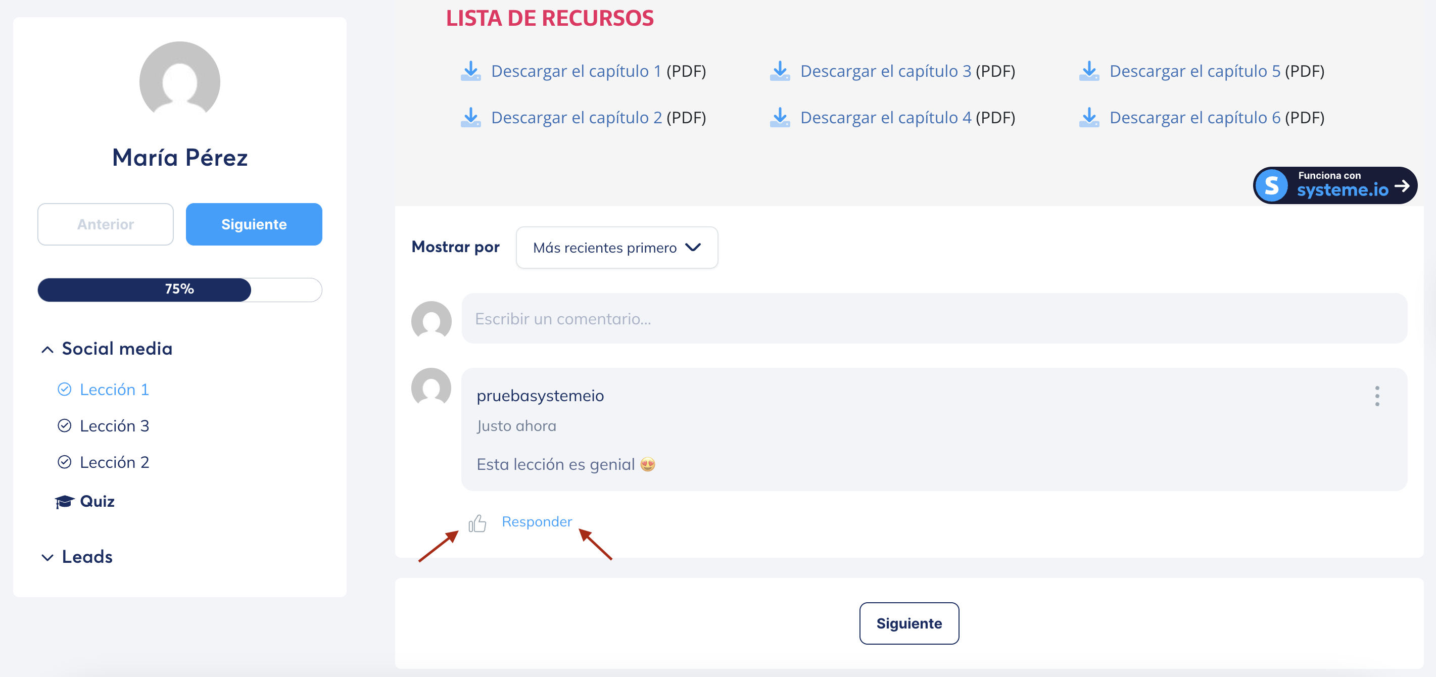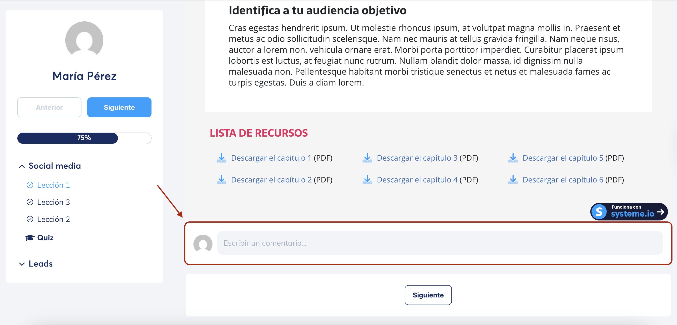 Importante: El elemento comentarios solo está disponible en la configuración de la lección y no puede ser agregado a la página de un blog o a la etapa de un túnel.