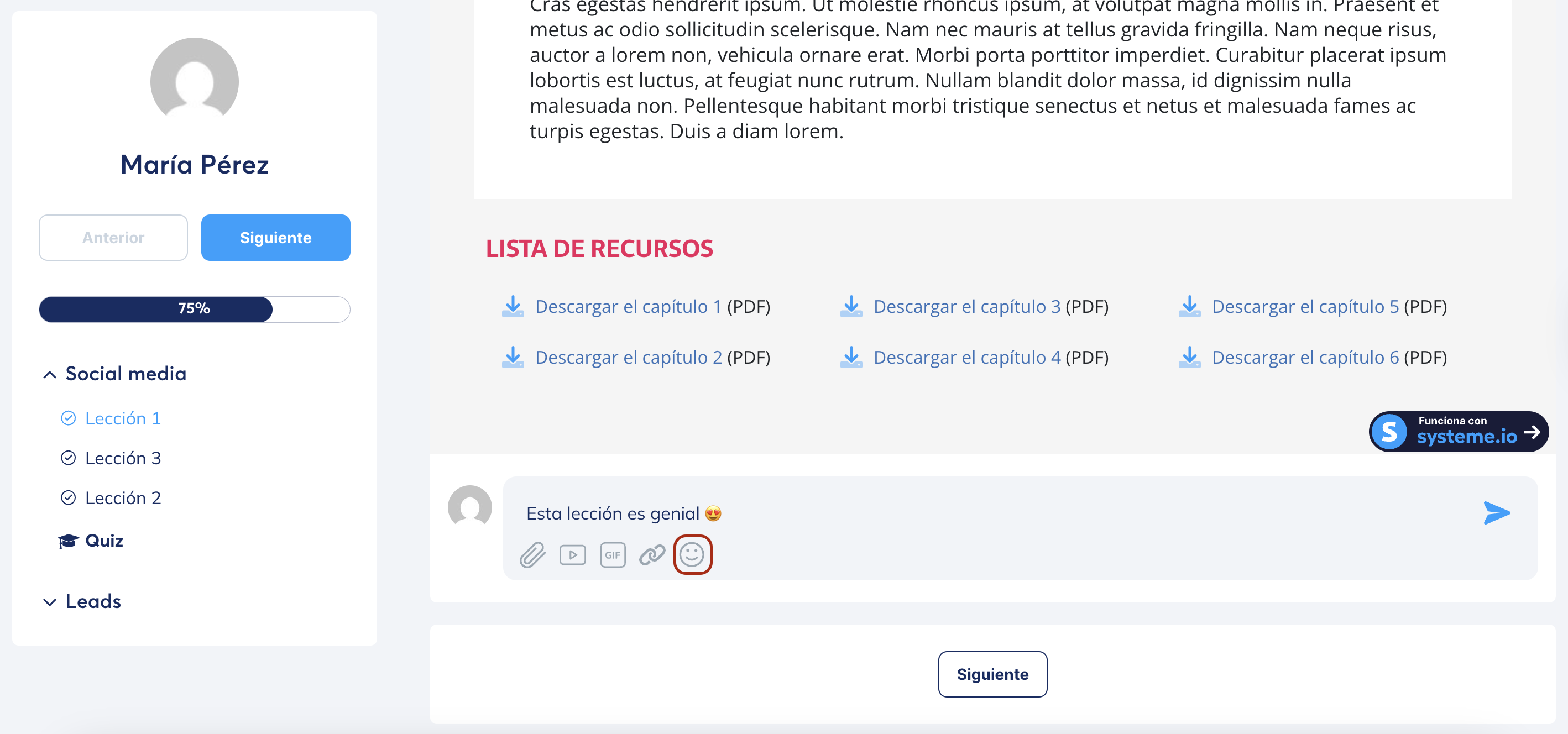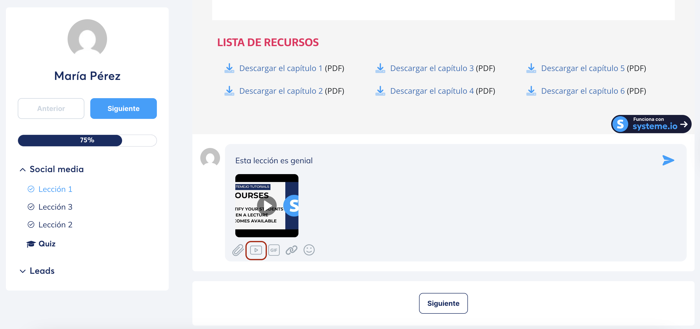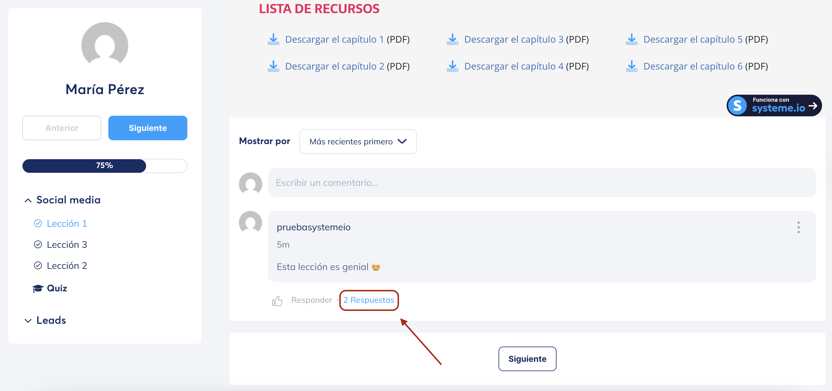 Importante: El elemento comentarios solo está disponible en la configuración de la lección y no puede ser agregado a la página de un blog o a la etapa de un túnel.