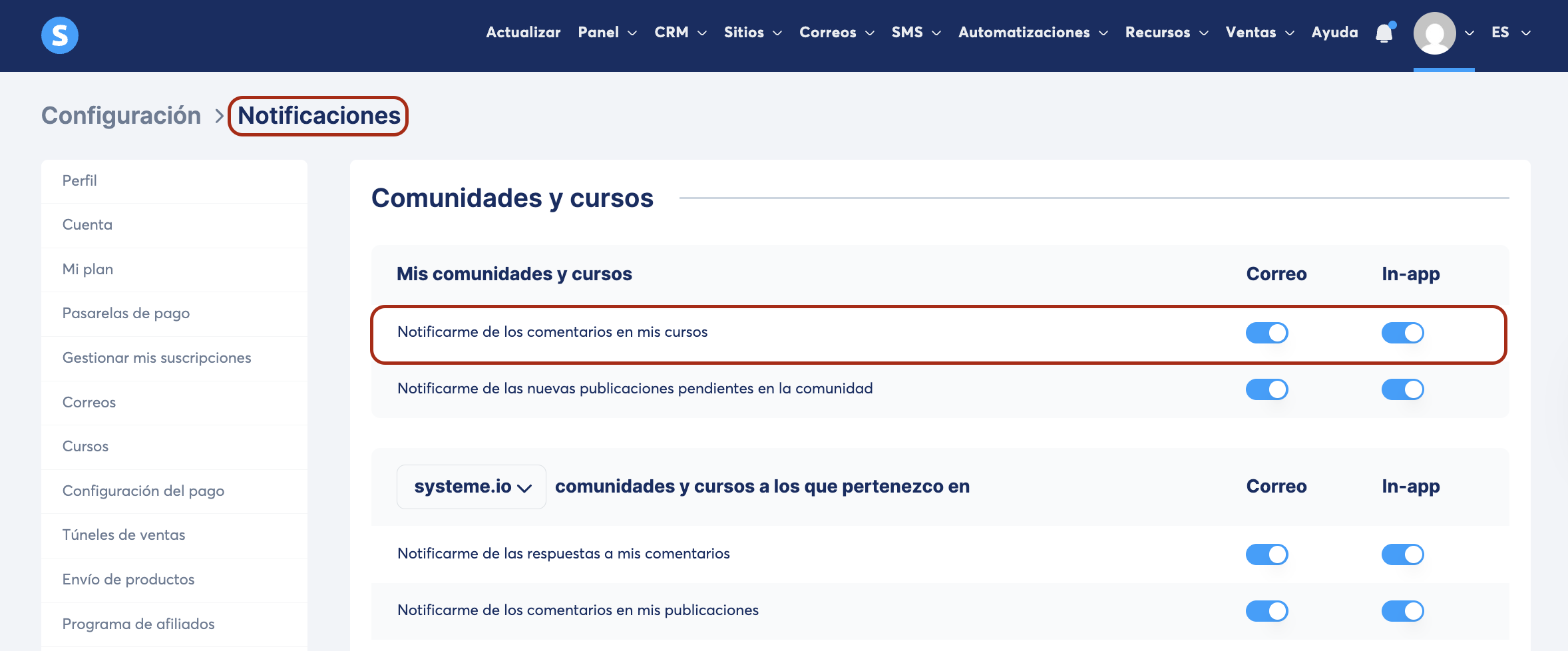 Para ser notificado de los nuevos comentarios de los estudiantes, ve a la sección de Notificaciones de tu configuración en systeme.io. Marca las casillas Correo o In-App junto a Notificarme de los comentarios en mis cursos.