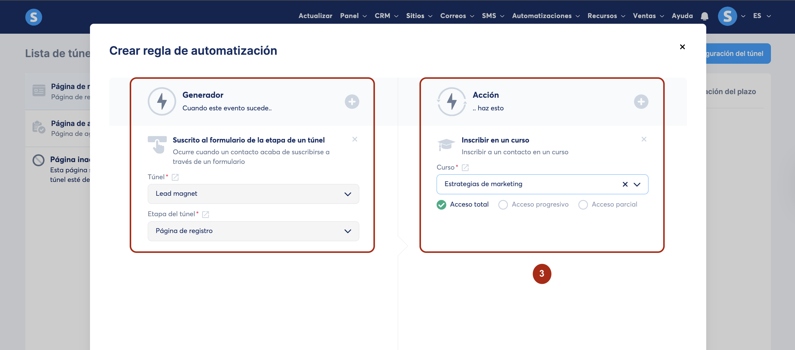 b. Agrega una regla de automatización con el generador Suscrito al formulario de la etapa de un túnel y la acción Inscribir en un curso (3)