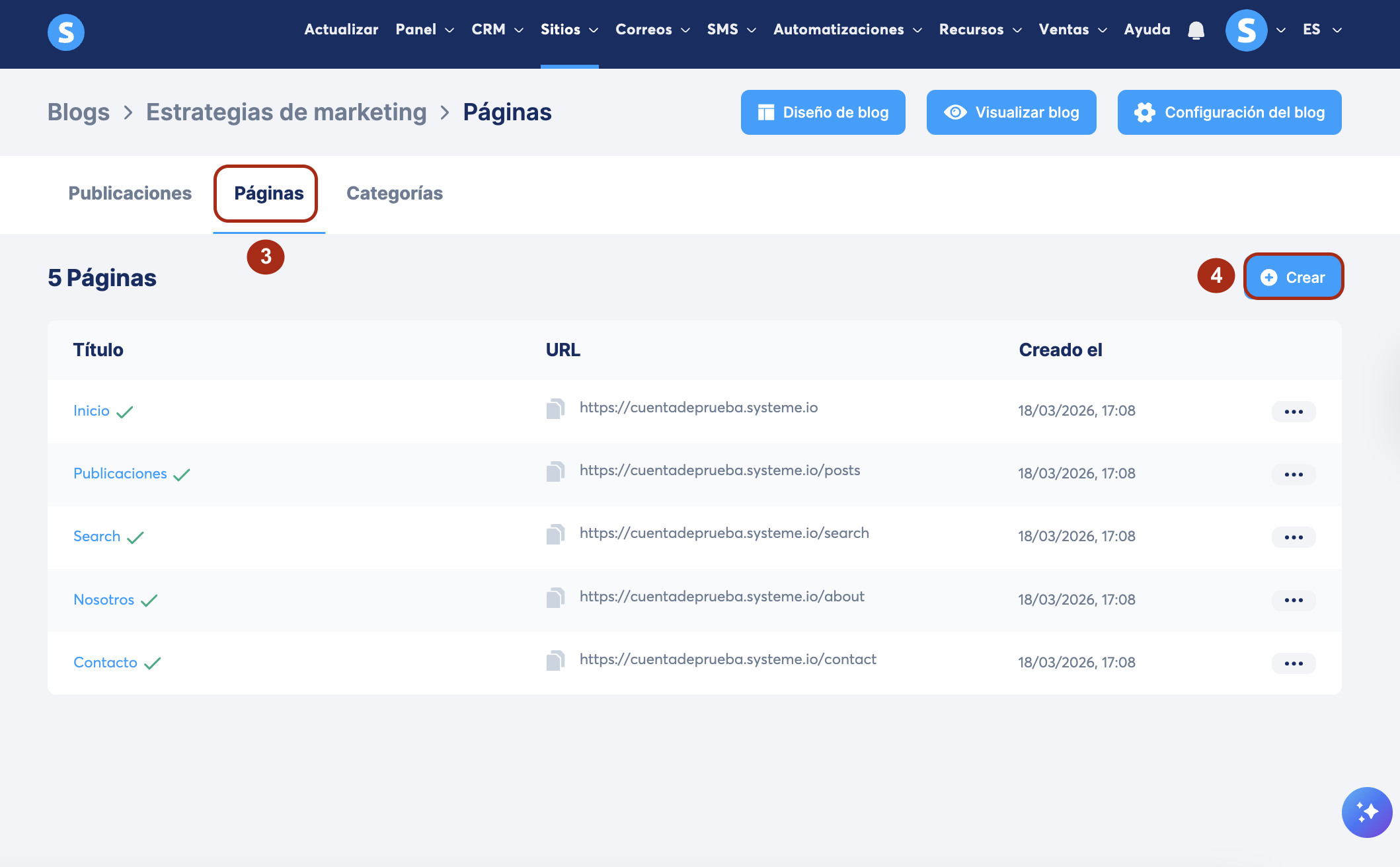 Luego haz clic en la pestaña Páginas (3) y luego en Crear (4).