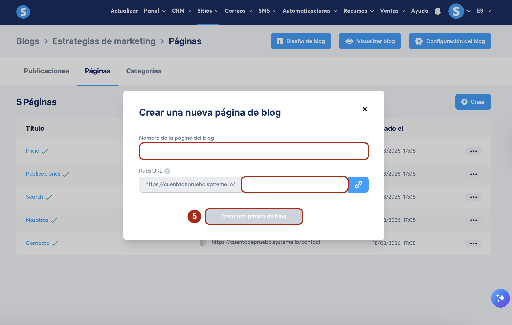 Ingresa el nombre de la página de blog y su ruta URL en la ventana emergente, luego haz clic en Crear una página de blog (5) para validar la creación de la nueva página de blog.
