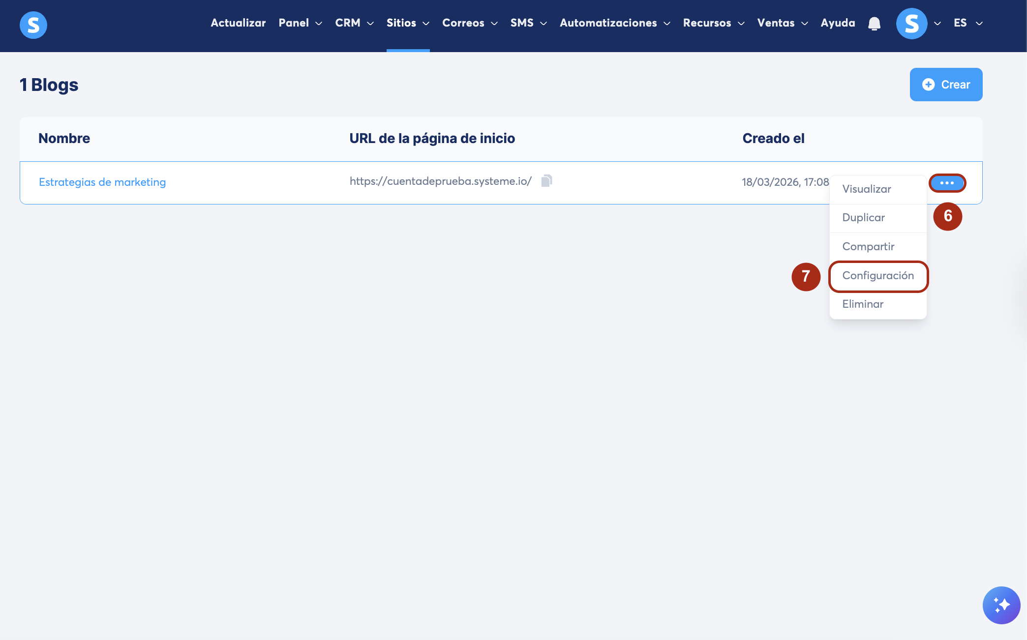 Haz clic en los tres puntos (6) del blog seleccionado y luego en Configuración (7).