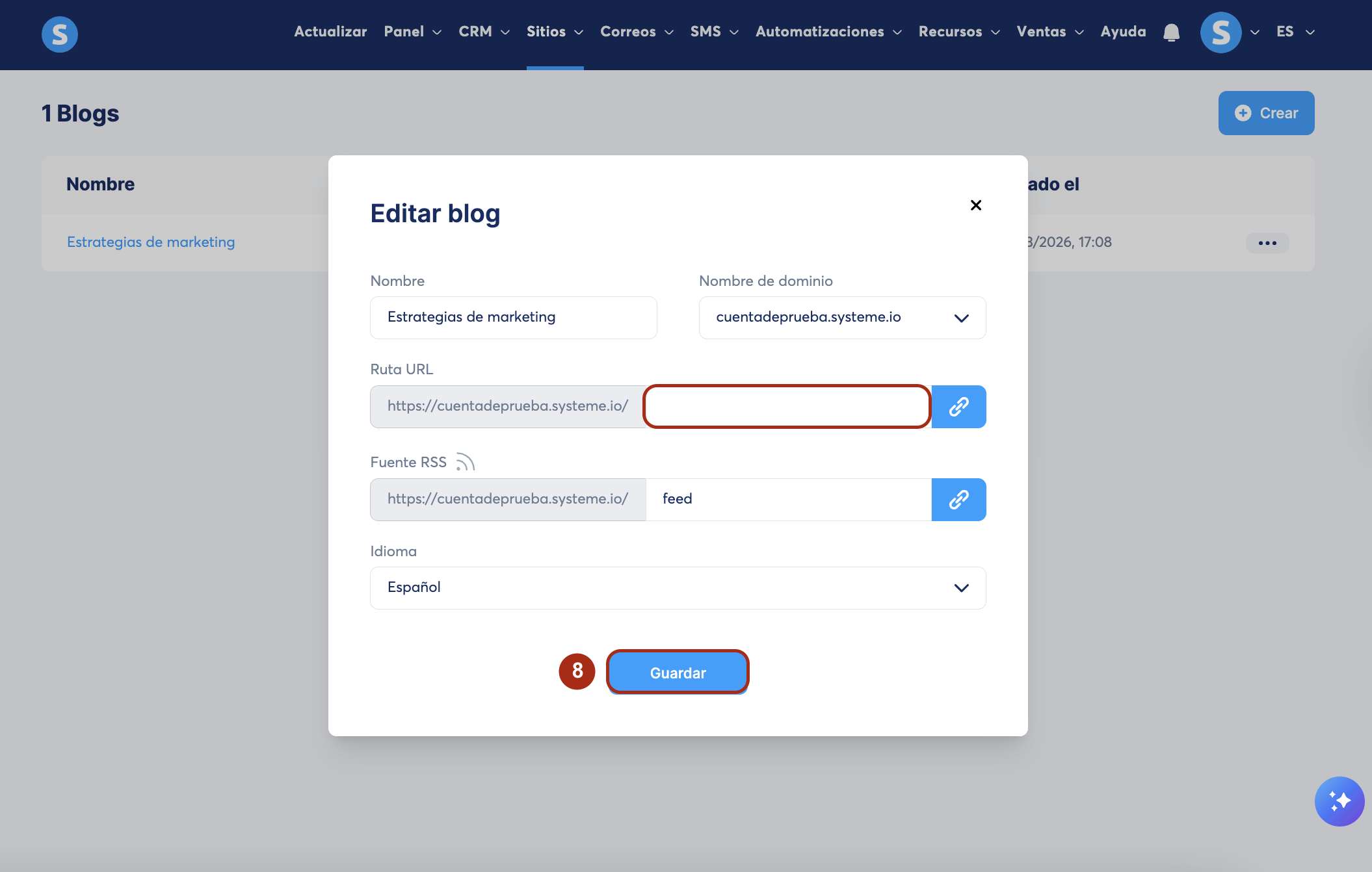 Elimina la ruta URL y haz clic en Guardar (8). De esta forma, la página de inicio de tu blog se convertirá en la página de inicio de tu sitio web.
