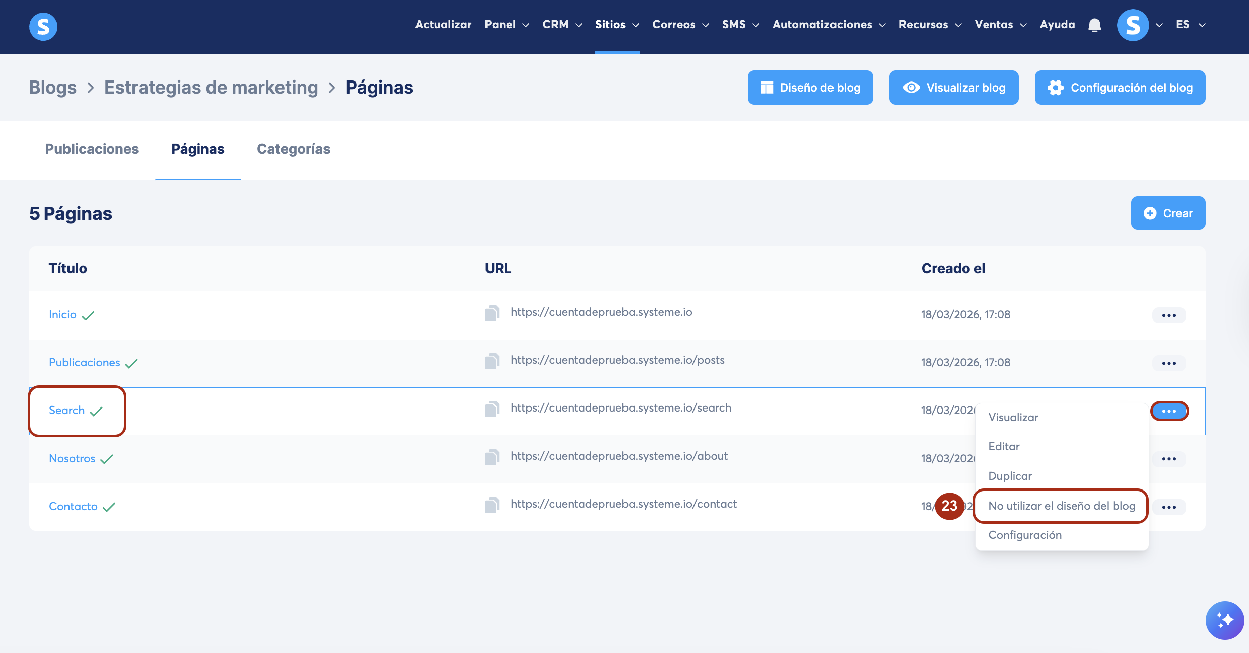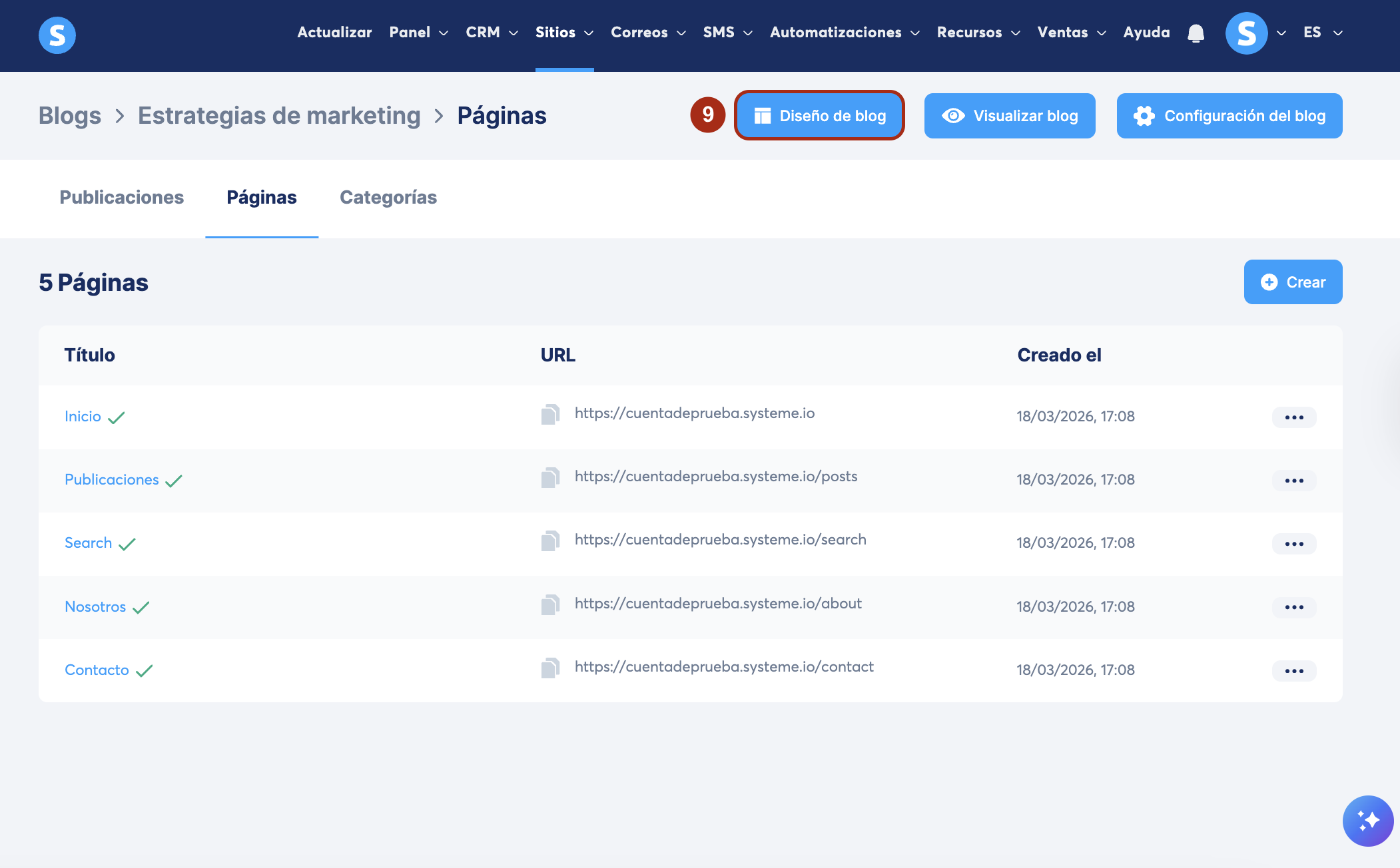 Nota: al crear un blog, este incluye automáticamente 4 páginas predeterminadas (páginas de inicio, nosotros, lista de publicaciones y página de contacto). Puedes editar estas páginas o agregar nuevas.