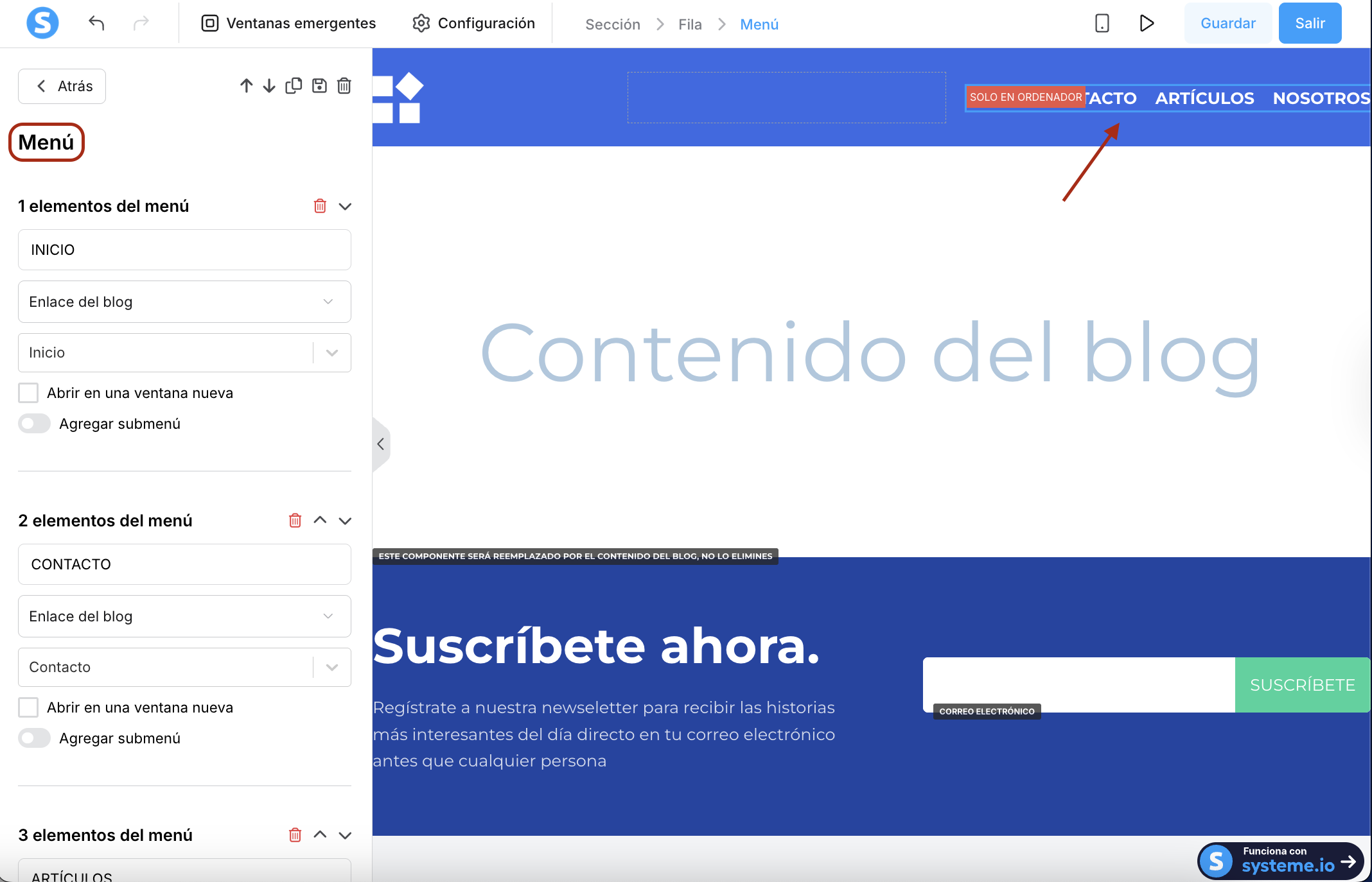 Nota: el menú de tu sitio web aparecerá en todas las páginas de tu blog.