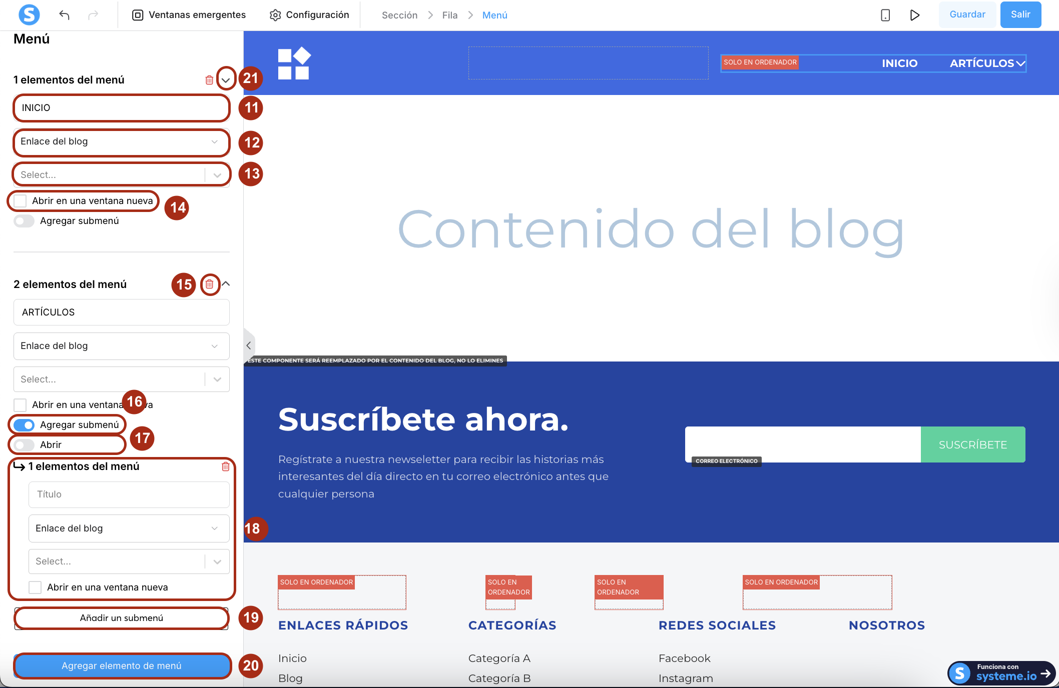 - Abrir (17): Muestra los elementos del submenú dentro del editor para que puedas previsualizar y editar su apariencia.