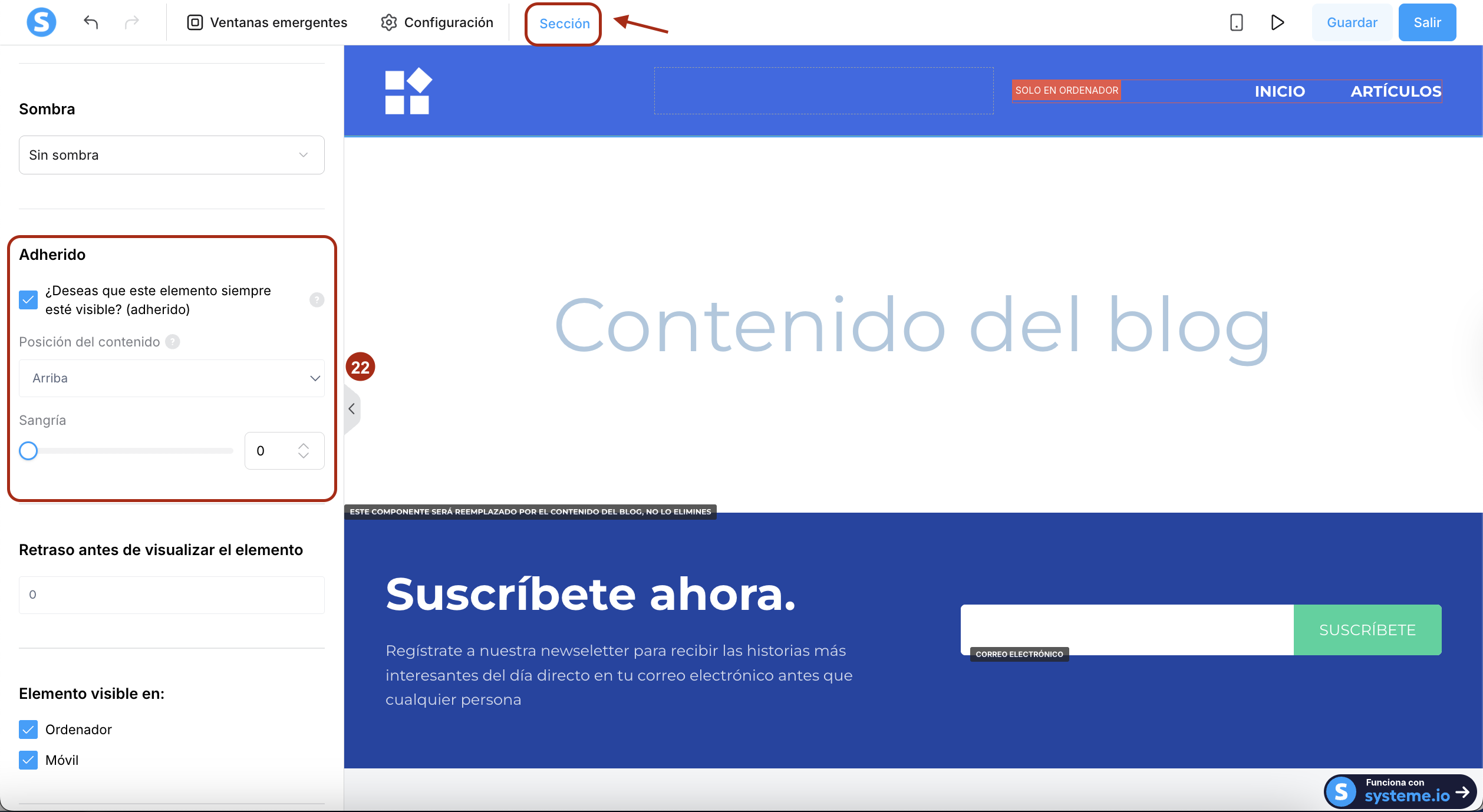 - Marca la casilla ¿Deseas que este elemento siempre esté visible? (adherido). Luego elige si deseas que la sección adherida quede arriba o abajo de la página.