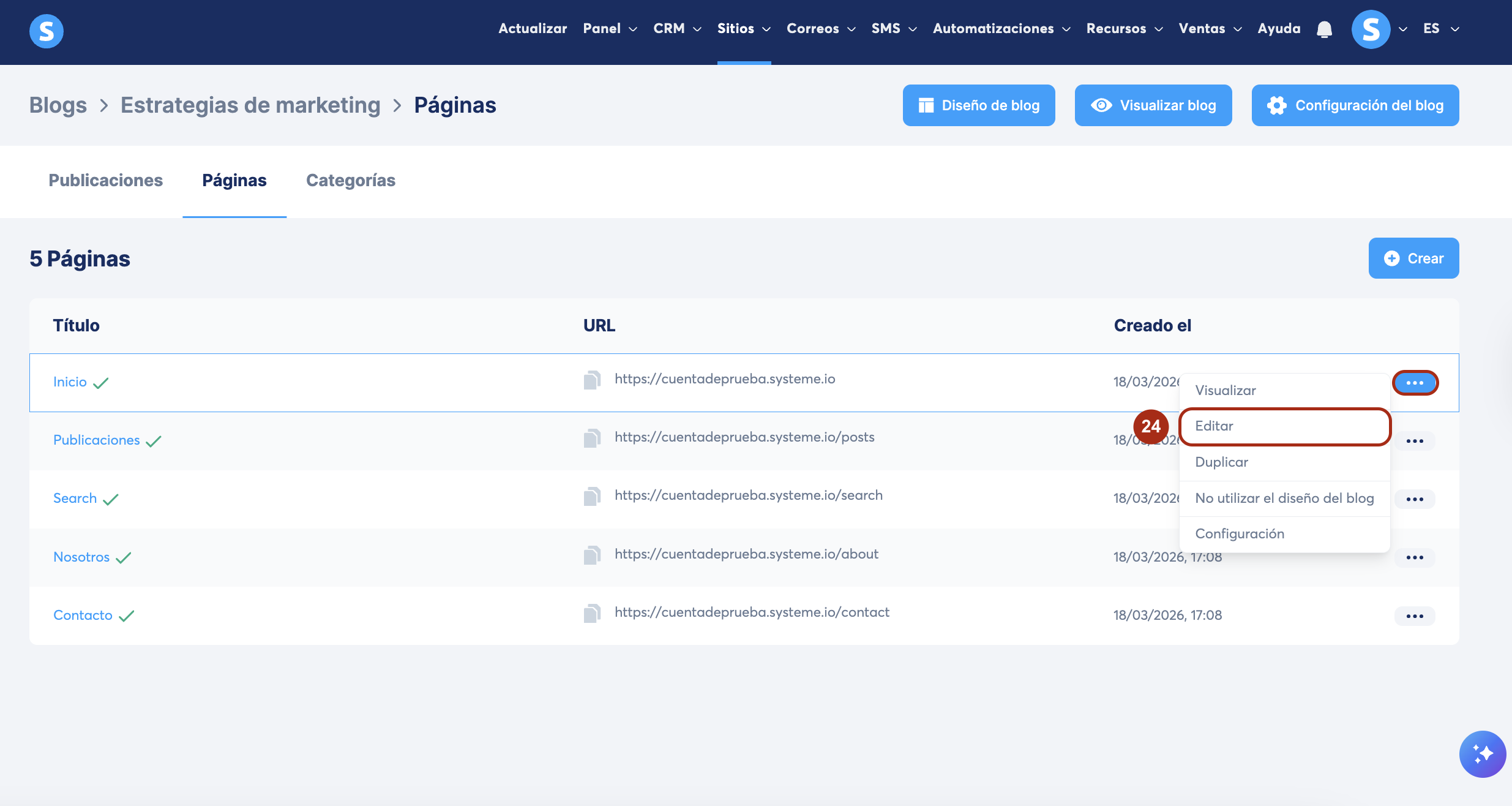 Para hacerlo, abre el editor de la página que deseas diseñar, haciendo clic en Editar (24) o haciendo clic directamente en el nombre de la página.
