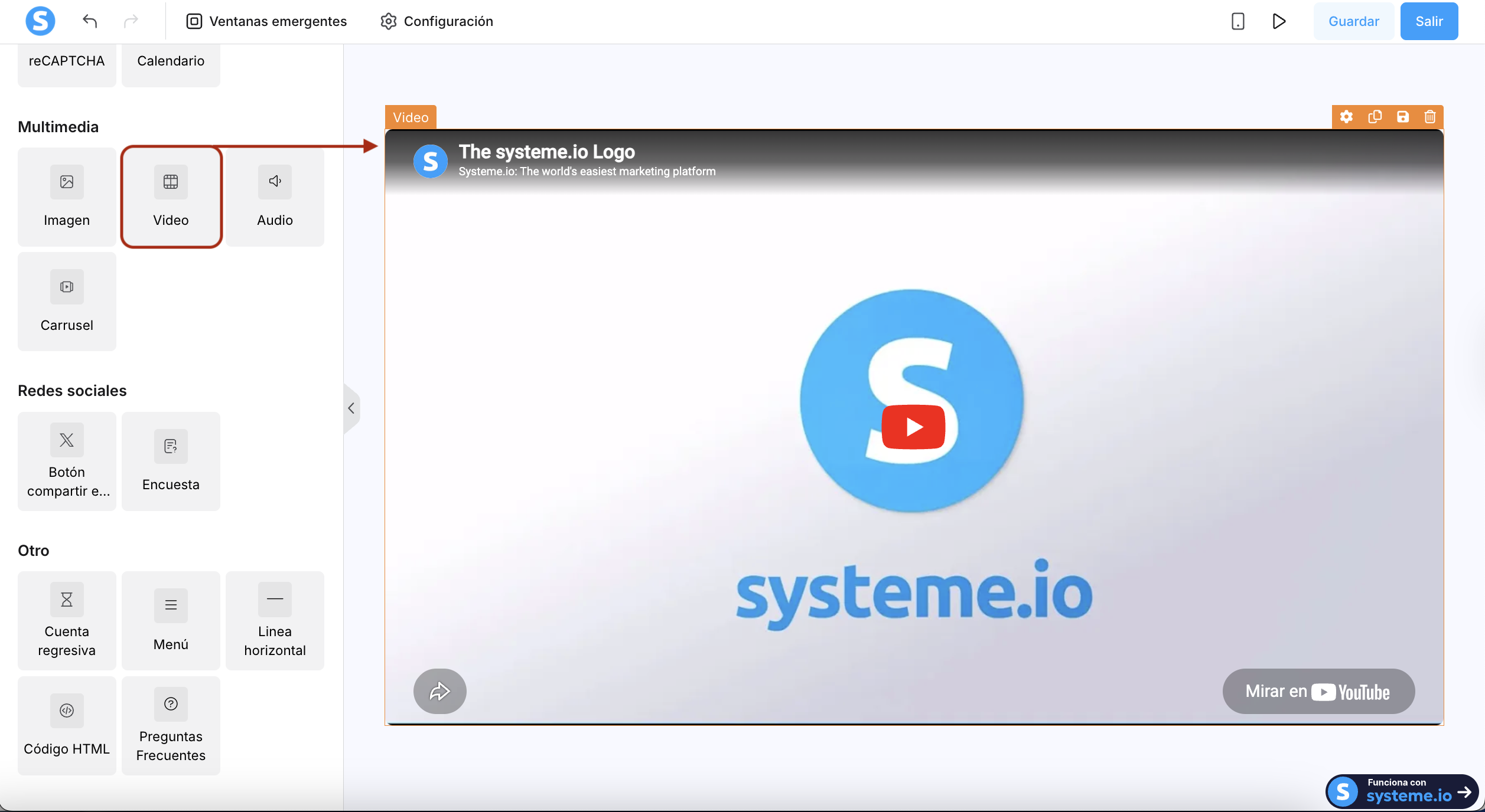 Aquí puedes ver cómo agregar el elemento Video a tu página, como en el ejemplo: