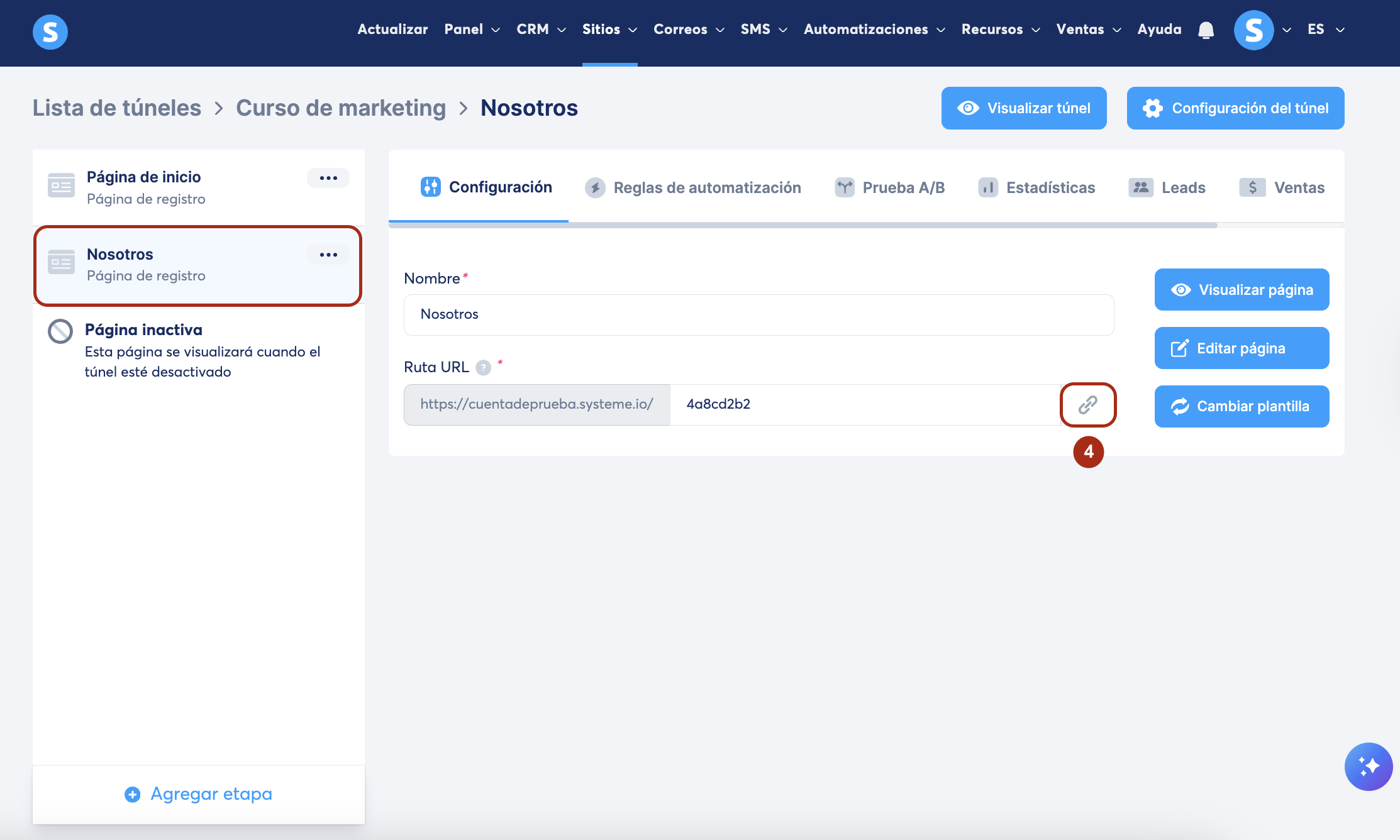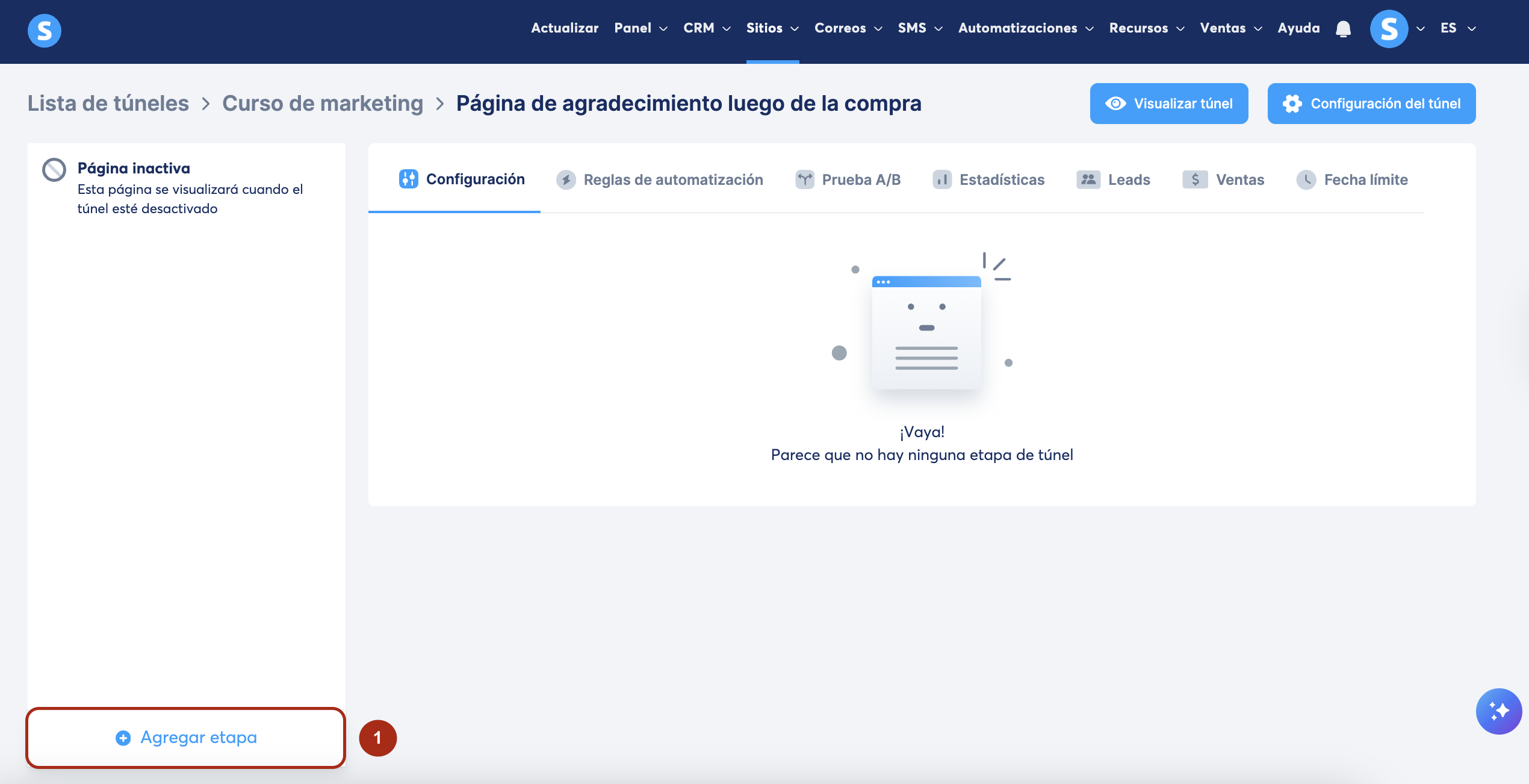 Cuando hayas creado tu túnel, agrega nuevas páginas (o etapas) a él; estas páginas funcionan como las páginas de tu sitio web. Te recomendamos agregar cinco páginas a tu túnel.