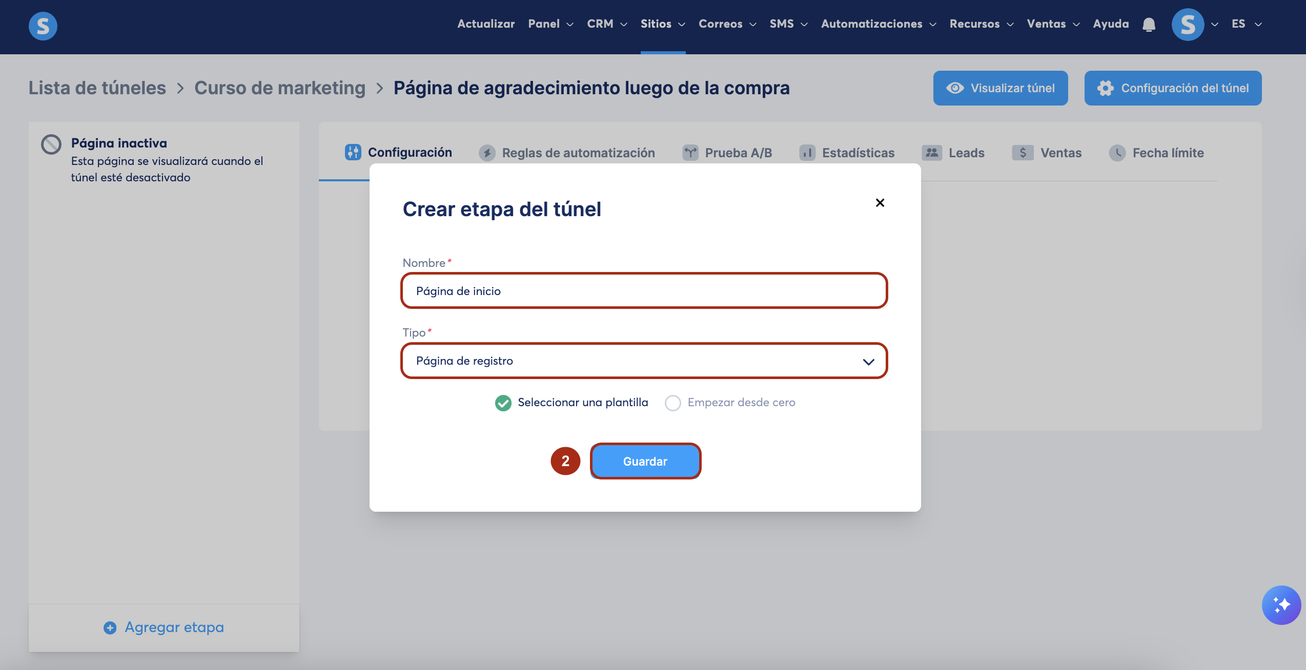Escribe el título de la página y elige el tipo, luego haz clic en Guardar (2).