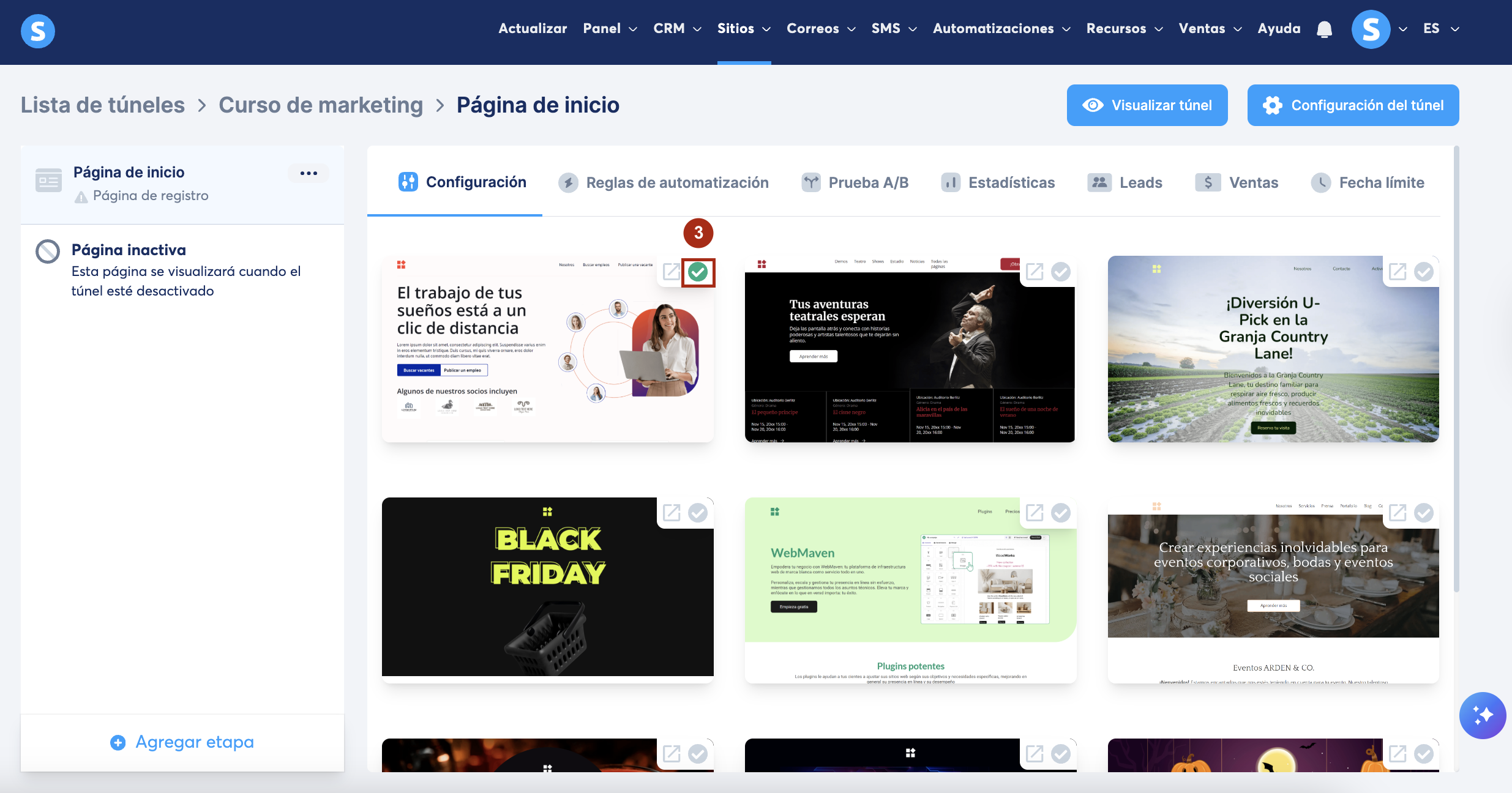 Selecciona la plantilla de tu elección haciendo clic en la marca verde (3) y diseña la página según tus preferencias.