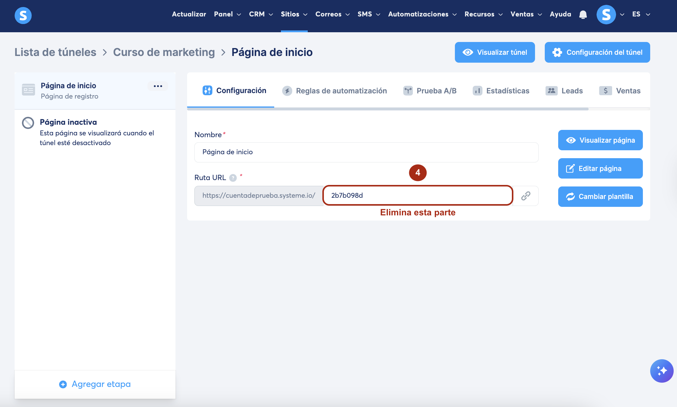 Paso 2: define una página de tu túnel como la página de inicio de tu sitio web
