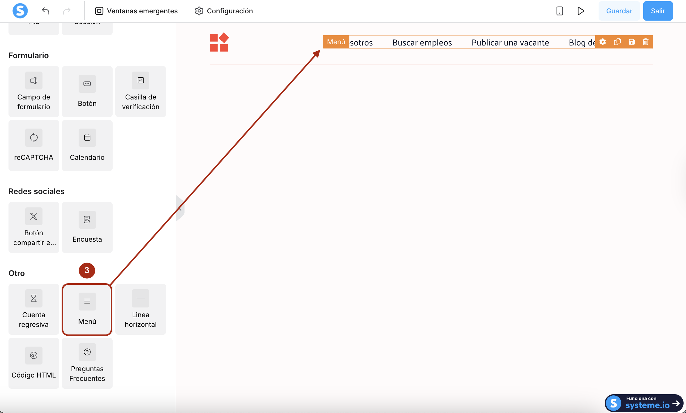 Abre el editor de tu página de inicio, arrastra el elemento Menú (3) y suéltalo en tu página.