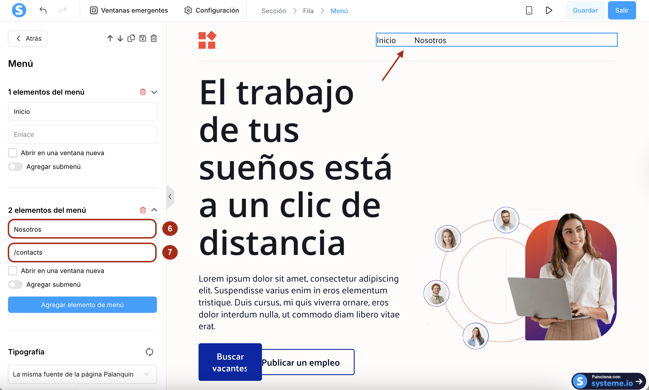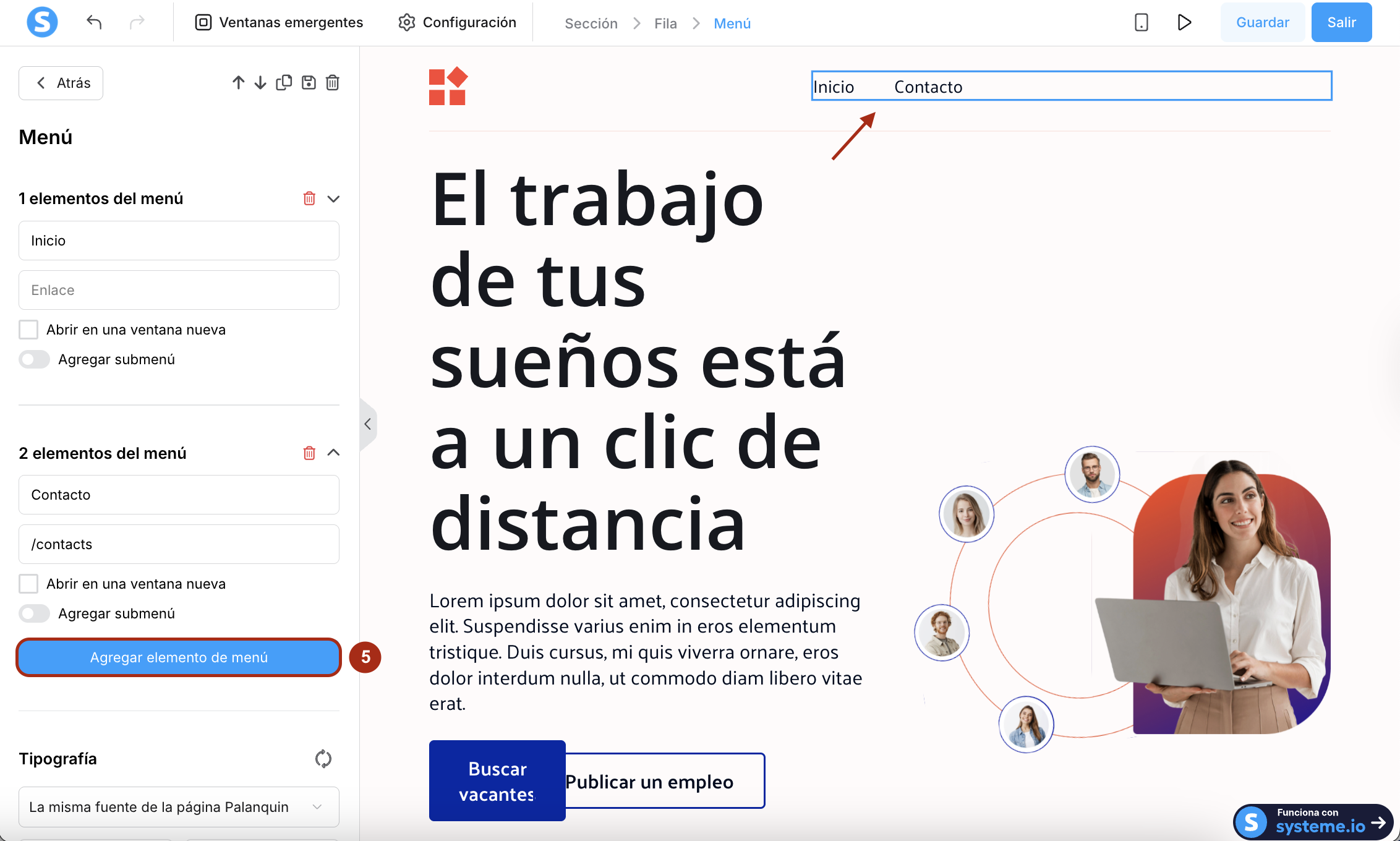 Regresa al editor de tu página de inicio, haz clic en el elemento Menú para abrir su configuración y luego haz clic en Agregar elemento de menú (5).