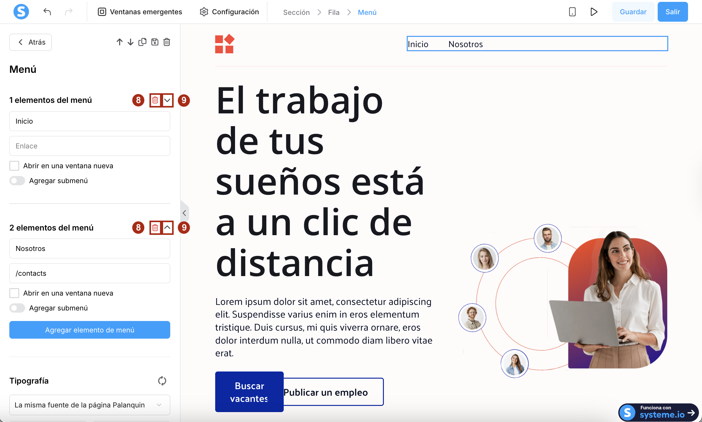 Puedes eliminar elementos del menú haciendo clic en el ícono de papelera (8) y reorganizarlos haciendo clic en las flechas (9).