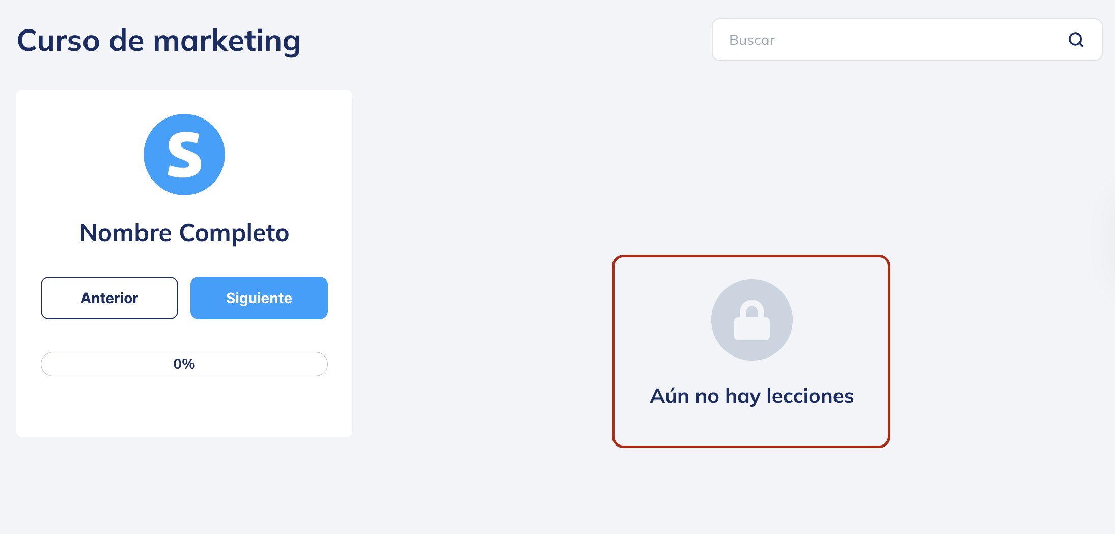 El mensaje Aún no hay lecciones se muestra cuando has creado tu curso, pero aún no se ha publicado ninguna lección.