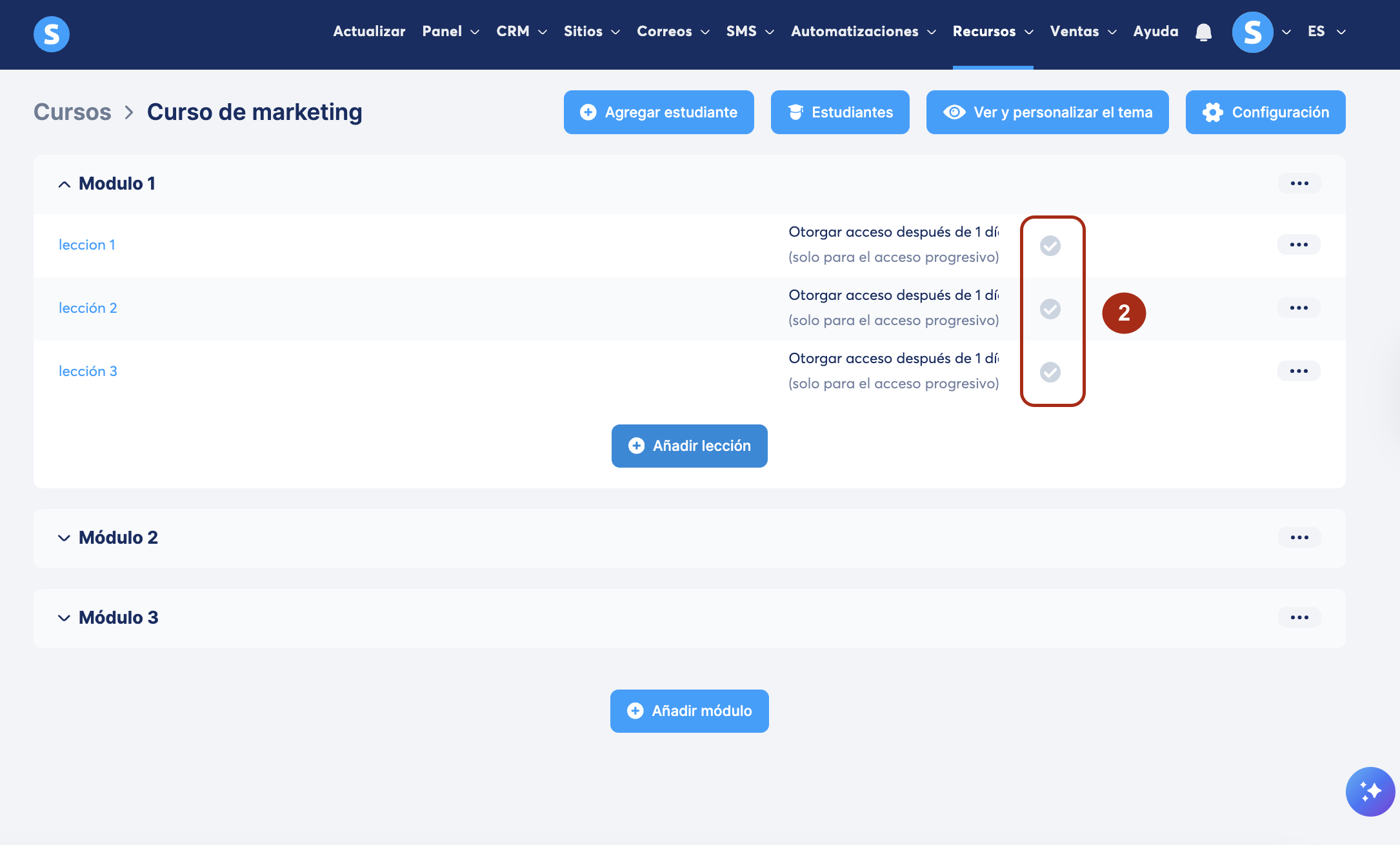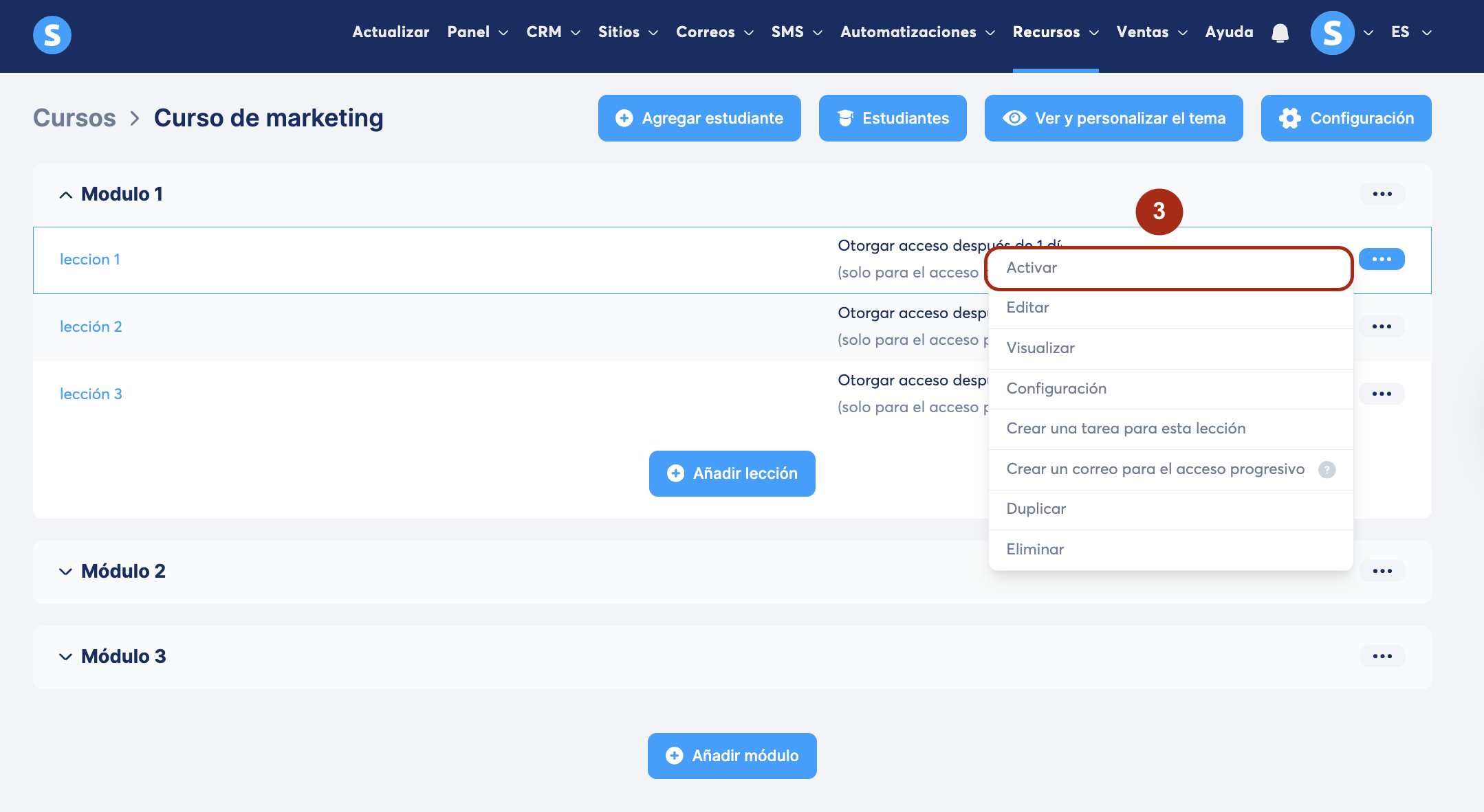 Para publicar una lección, pasa el mouse en los 3 puntos y haz clic en Activar (3).
