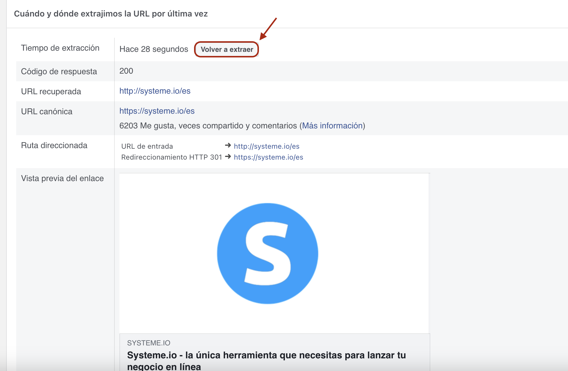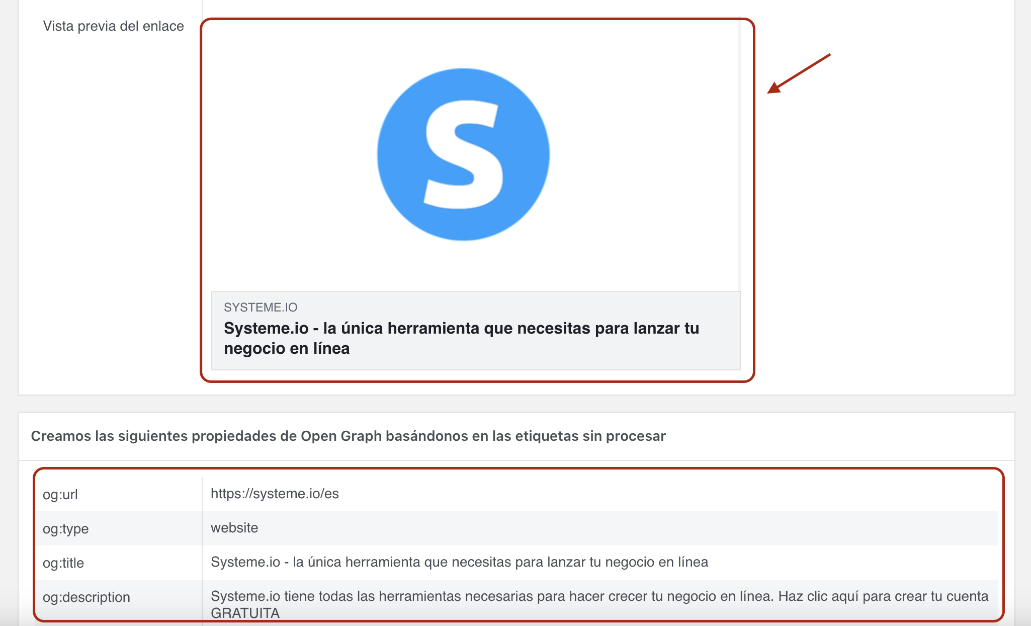 Tomemos de ejemplo la página https://systeme.io/es y el siguiente enlace de depuración de Facebook: