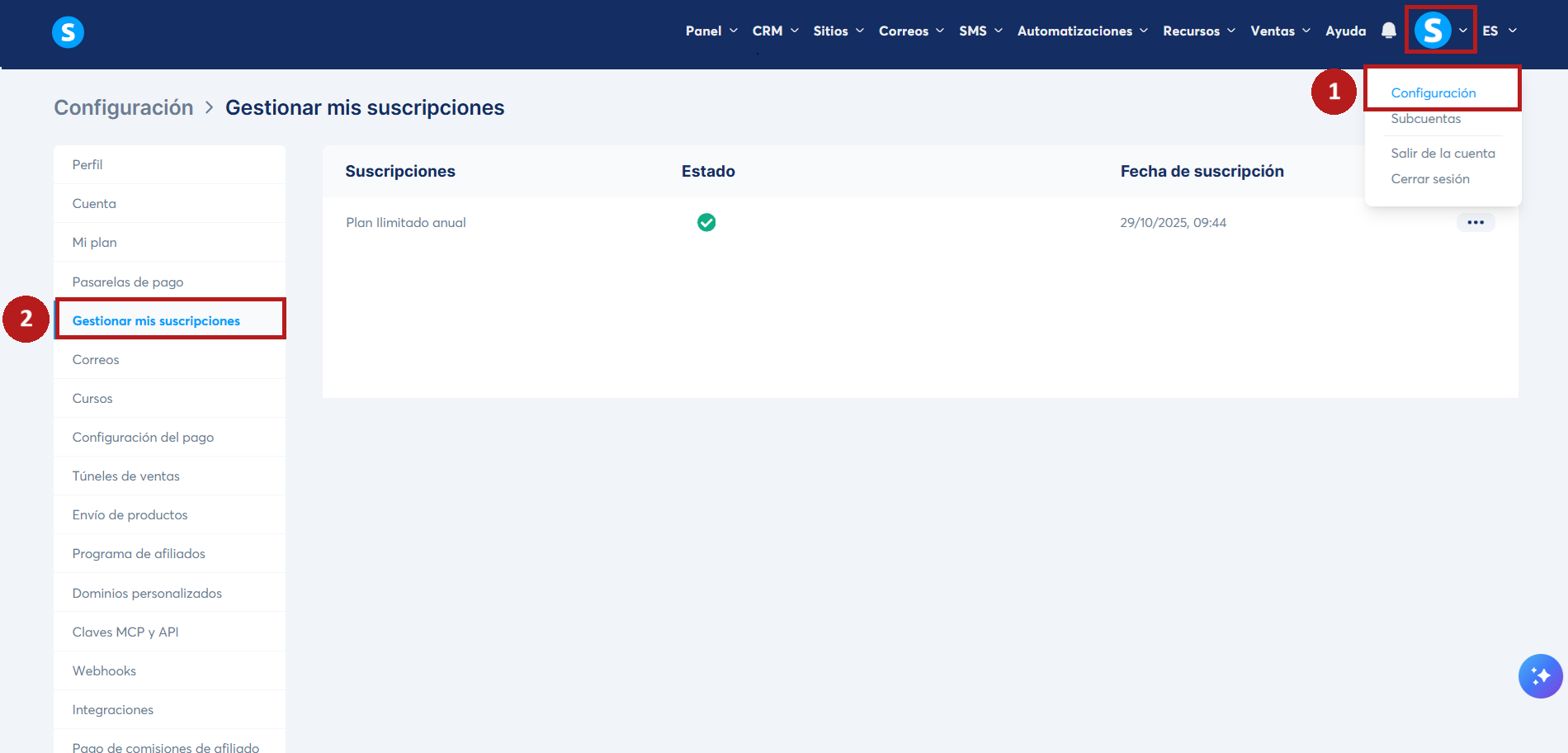 Desde el menú de configuración en el lado izquierdo, haz clic en Gestionar mis suscripciones (2) para mostrar la lista de tus suscripciones.