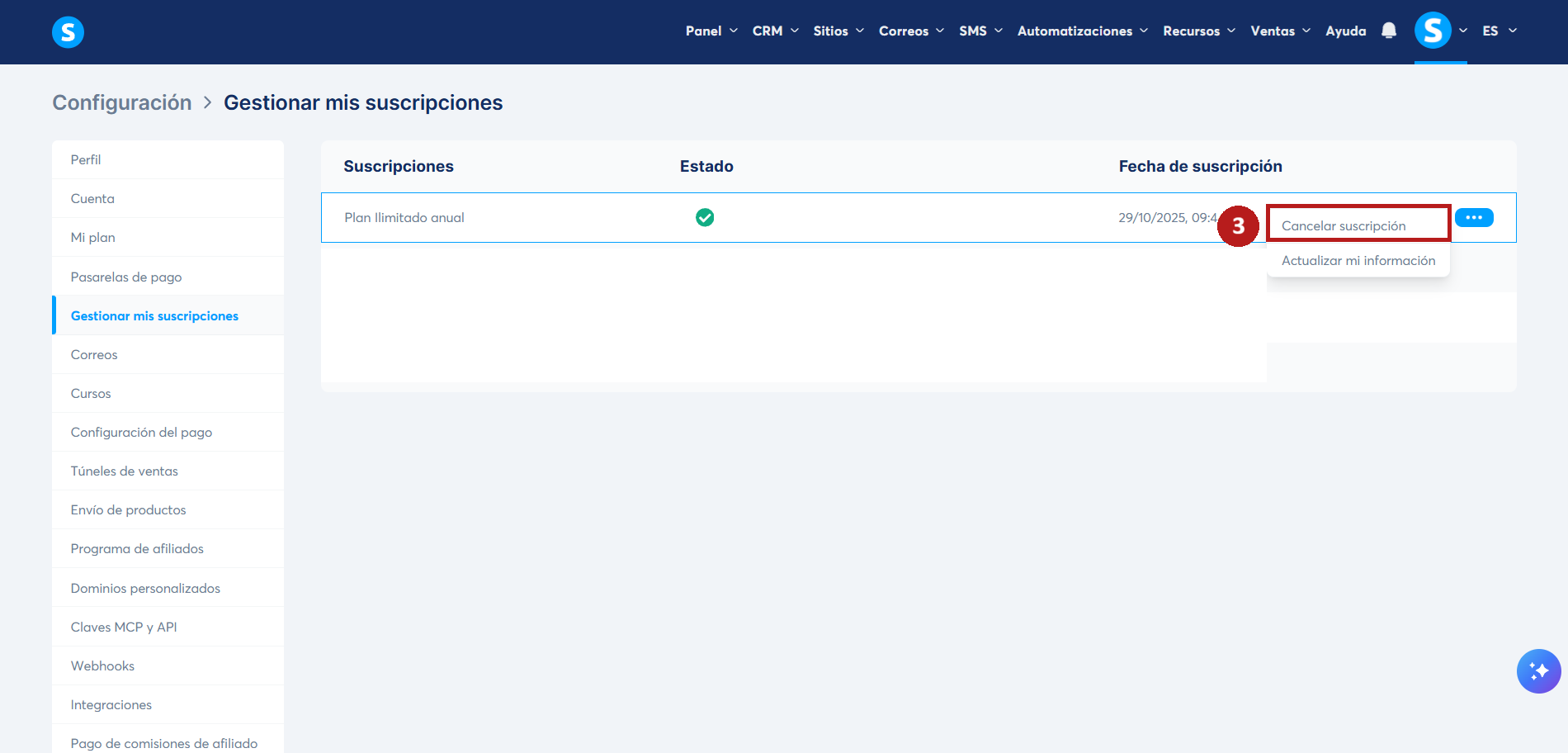 En la suscripción que deseas cancelar, haz clic en los tres puntos y luego en Cancelar suscripción (3).