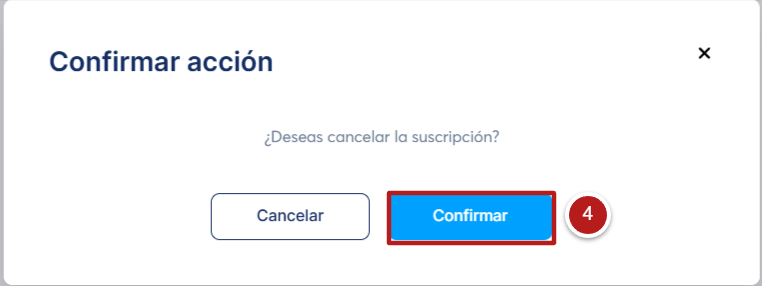 Aparecerá una ventana emergente solicitando que confirmes la cancelación. Haz clic en Confirmar (4) para cancelar tu suscripción.