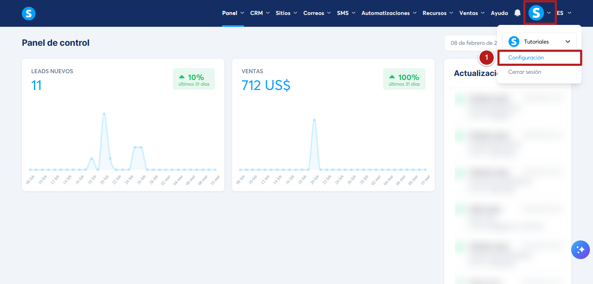 Para cambiar el subdominio de systeme.io de tu cuenta, haz clic en tu foto de perfil y luego en Configuración (1).