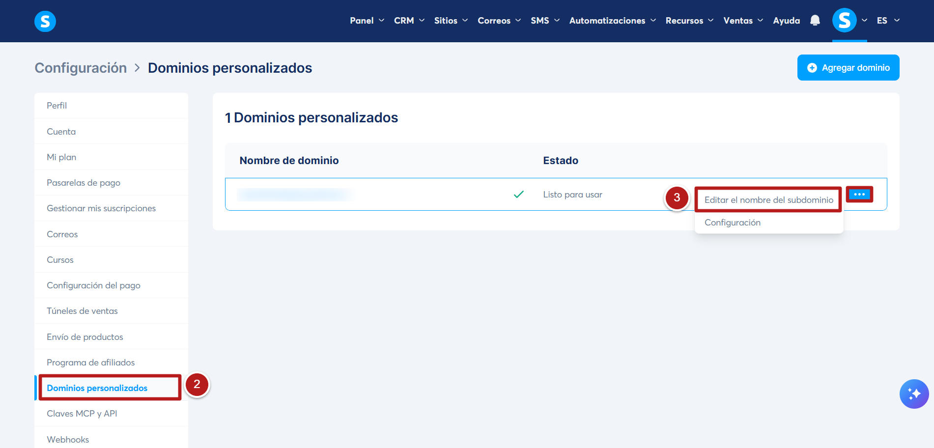 Desde el panel de configuración a la izquierda, haz clic en Dominios personalizados (2). Luego haz clic en el menú de 3 puntos y después en Editar el nombre del subdominio (3)