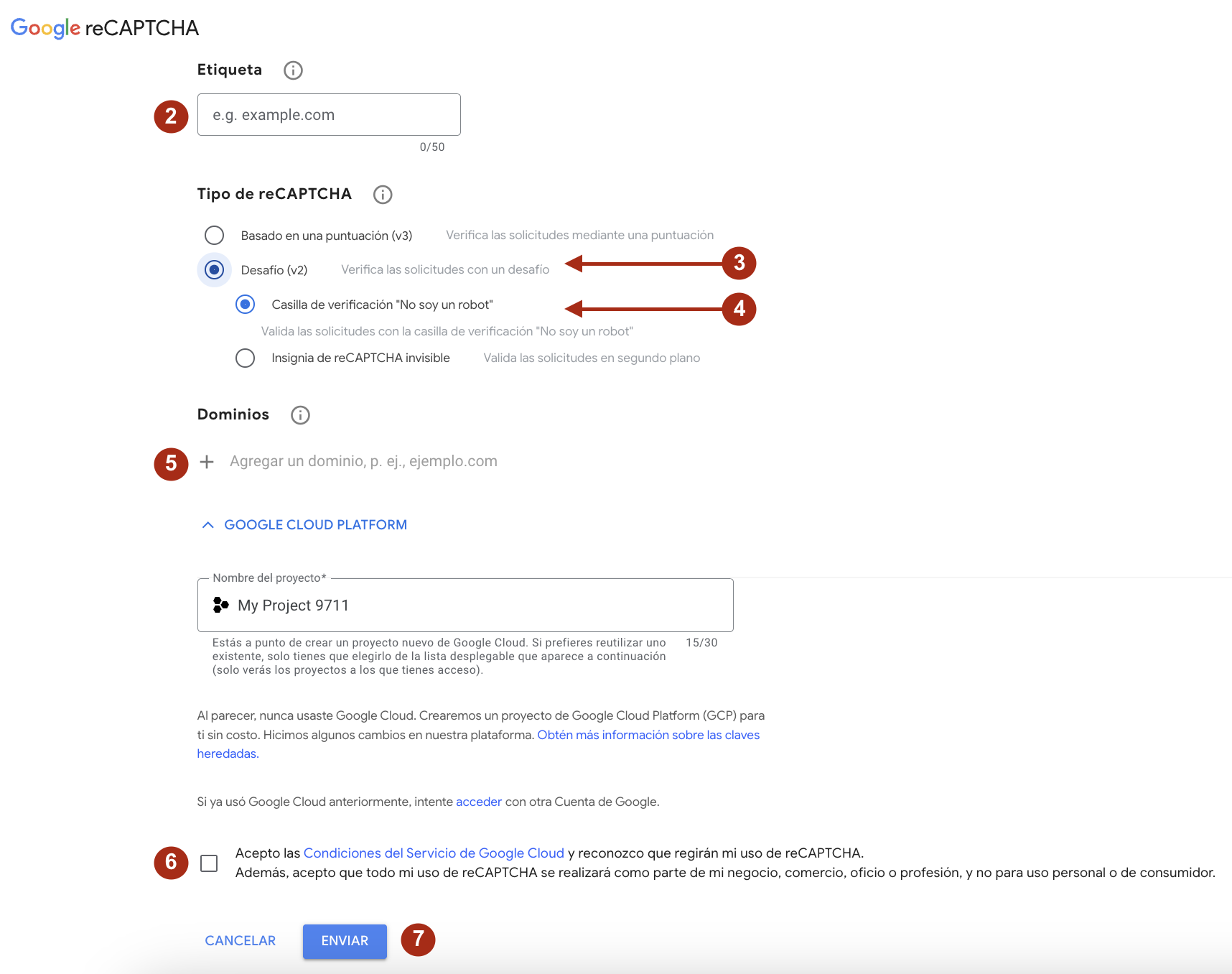 En el campo etiqueta, ingresa un nombre para identificar tu proyecto (2).