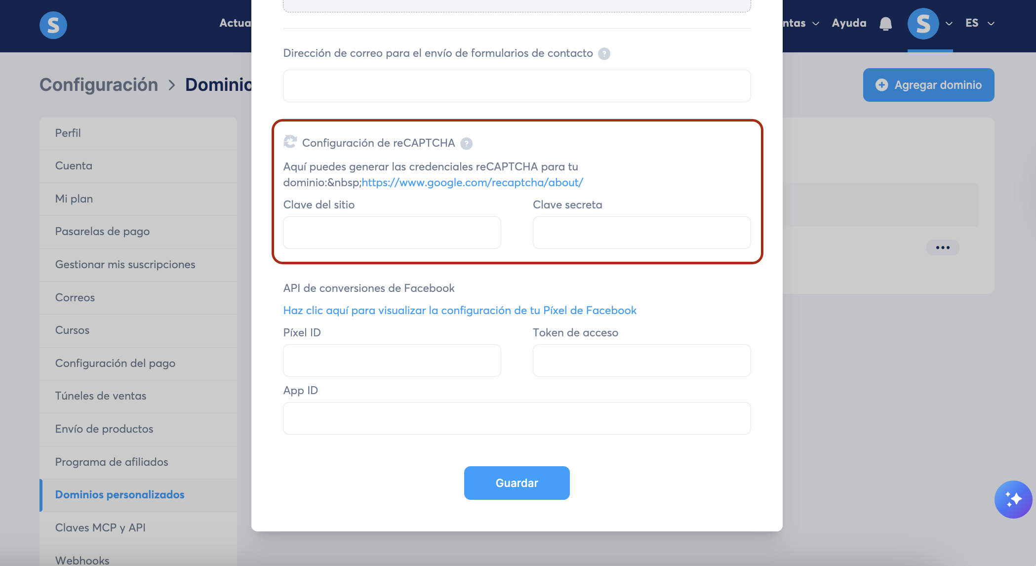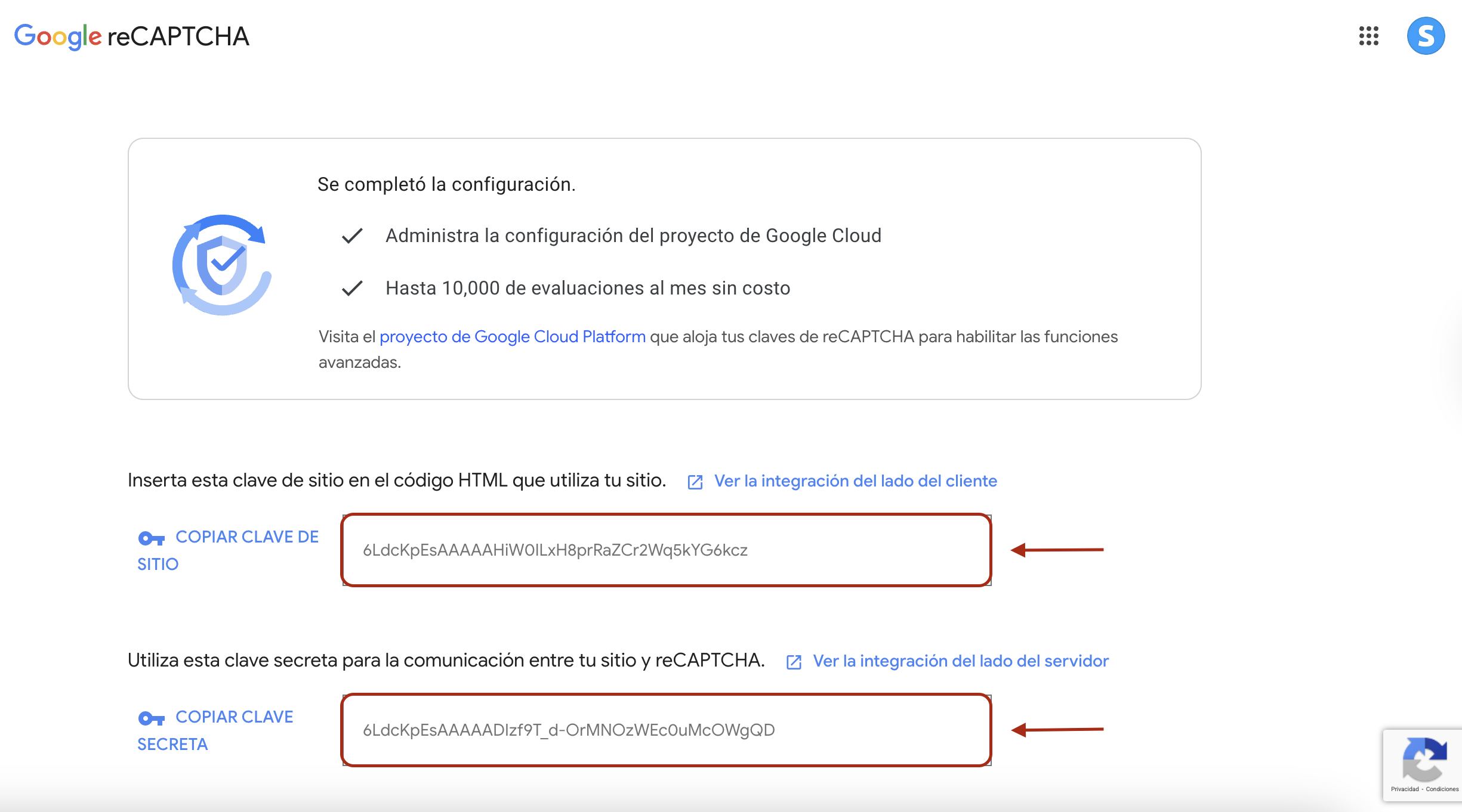 Desplázate hasta la sección Configuración de reCAPTCHA. Pega en los campos correspondientes la clave de sitio y la clave secreta generadas en Google.