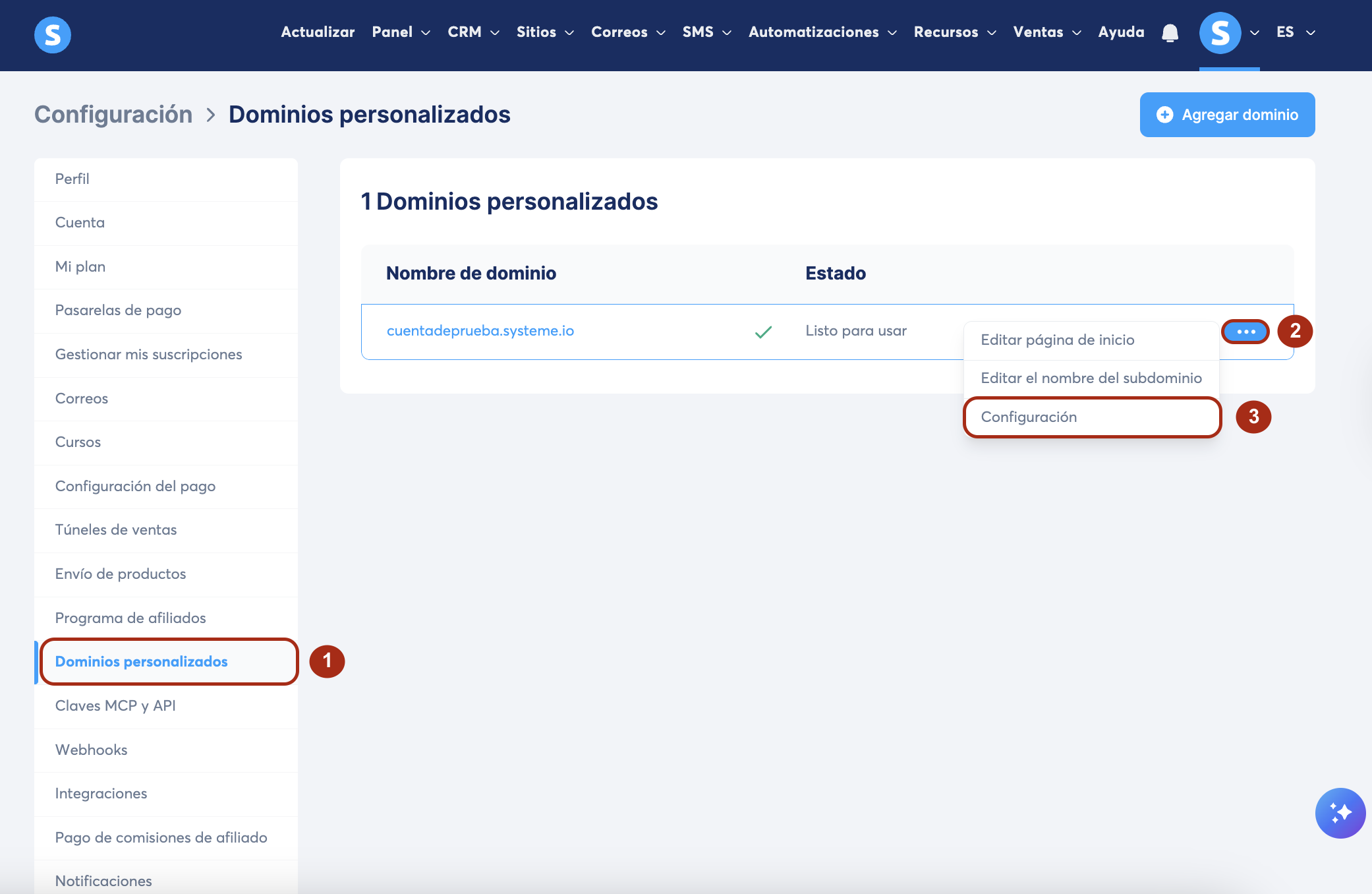 Ve a Configuración > Dominios personalizados (1). Haz clic en el ícono de los tres puntos (2) junto a tu dominio, luego haz clic en Configuración (3).