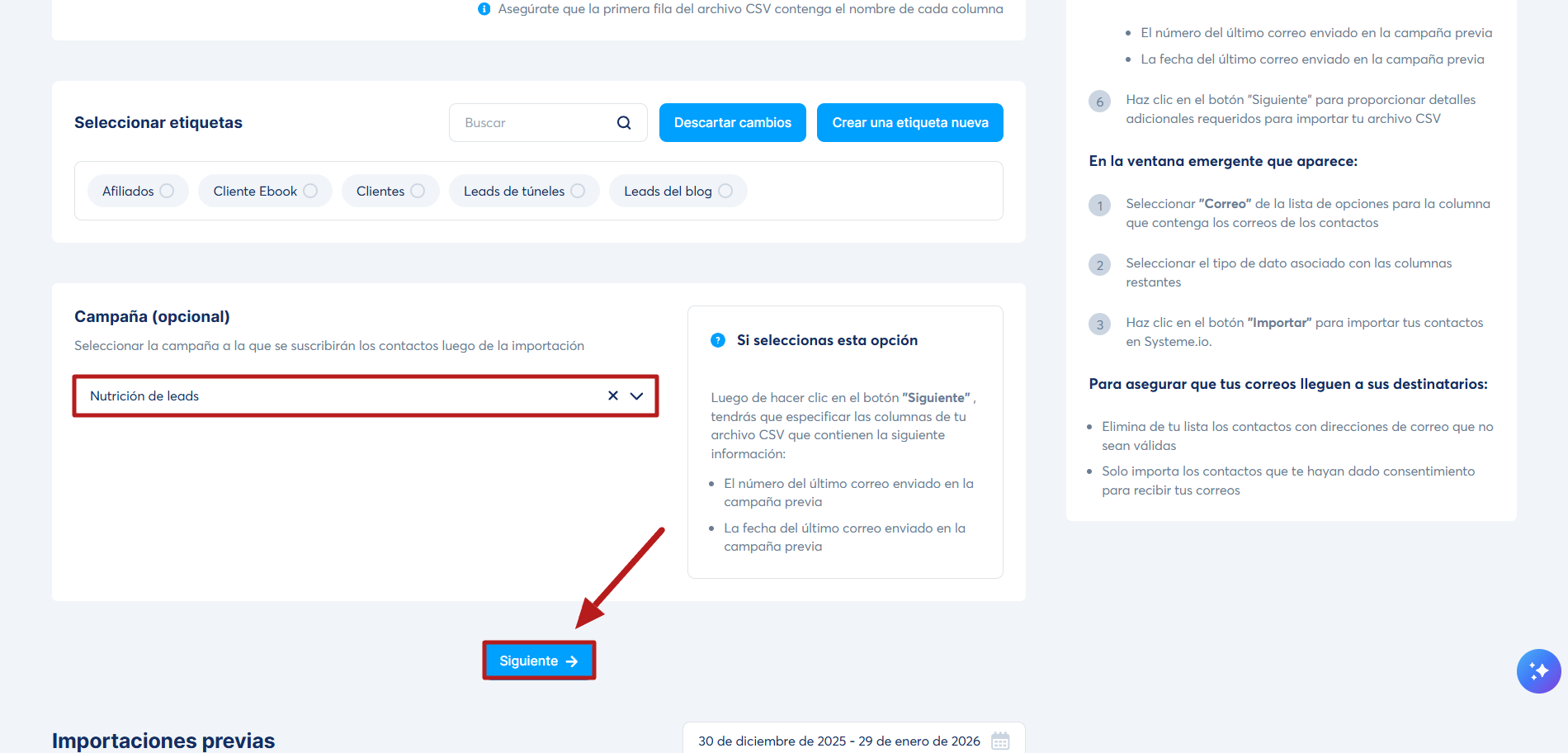 Al importar tu lista de contactos a systeme.io, haz clic en la lista desplegable de tu Campaña (opcional) y selecciona la campaña que desees. Luego haz clic en Siguiente