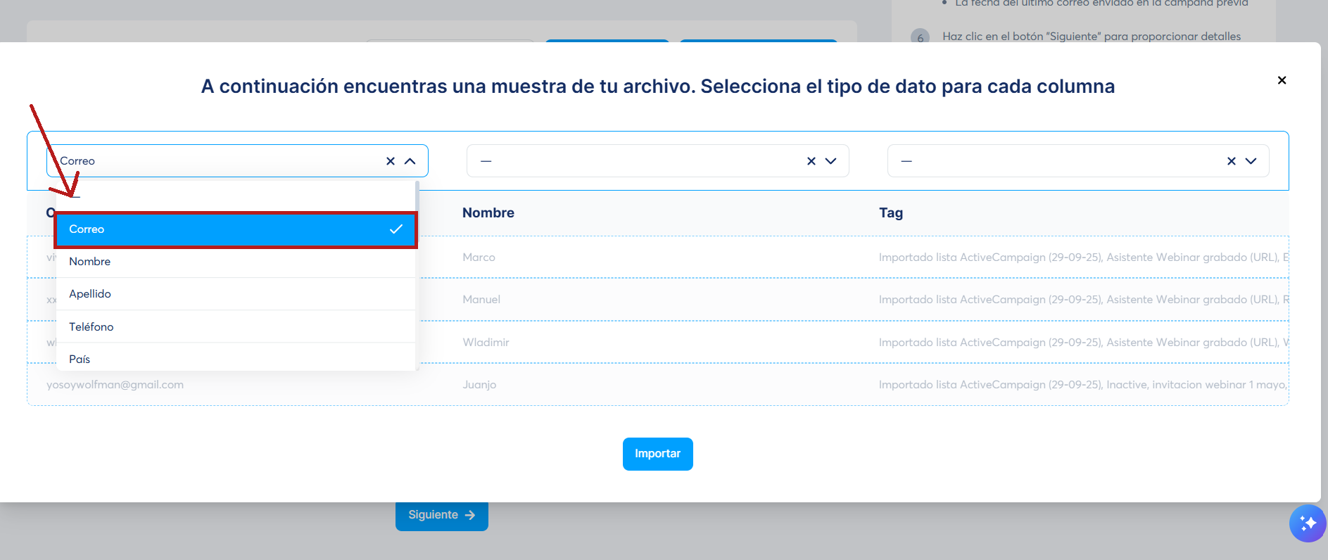 El archivo de importación debe contener el campo correo electrónico del contacto, así que selecciona la columna "Correo electrónico".