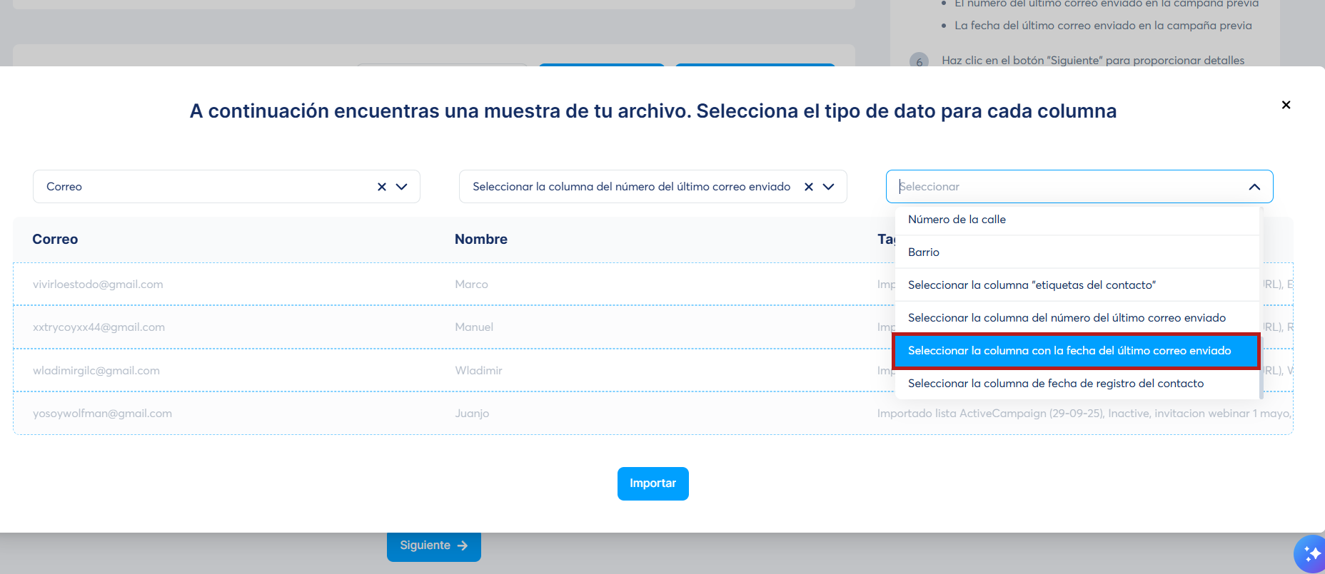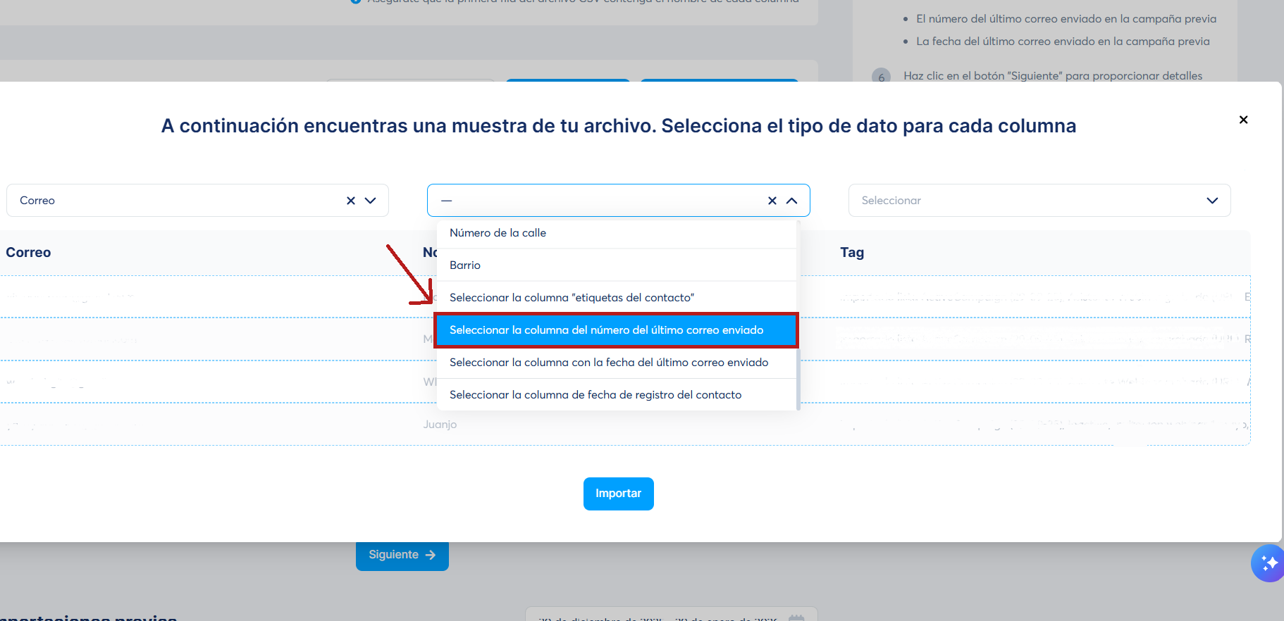 - El número del paso de la campaña en el sistema desde la cual fue migrada, selecciona la columna "Seleccionar la columna del número del último correo electrónico enviado"
