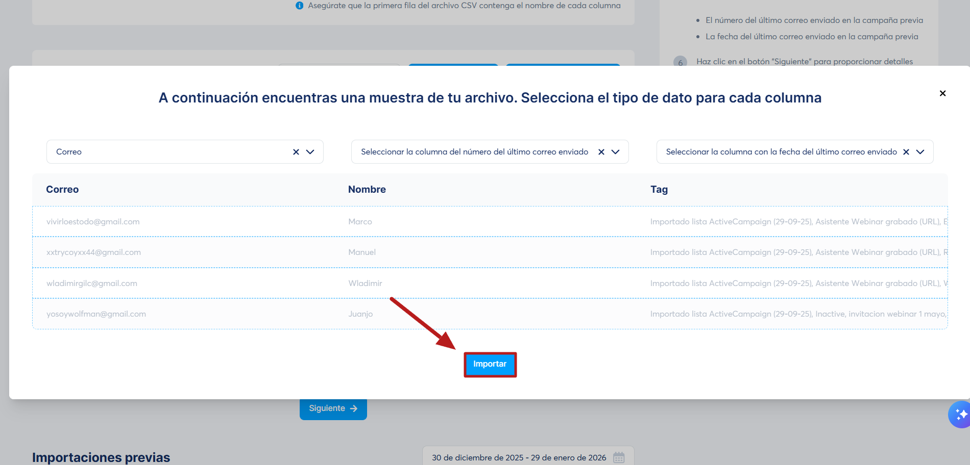 Cómo suscribir un contacto a una campaña de correo al importar una lista de contactos