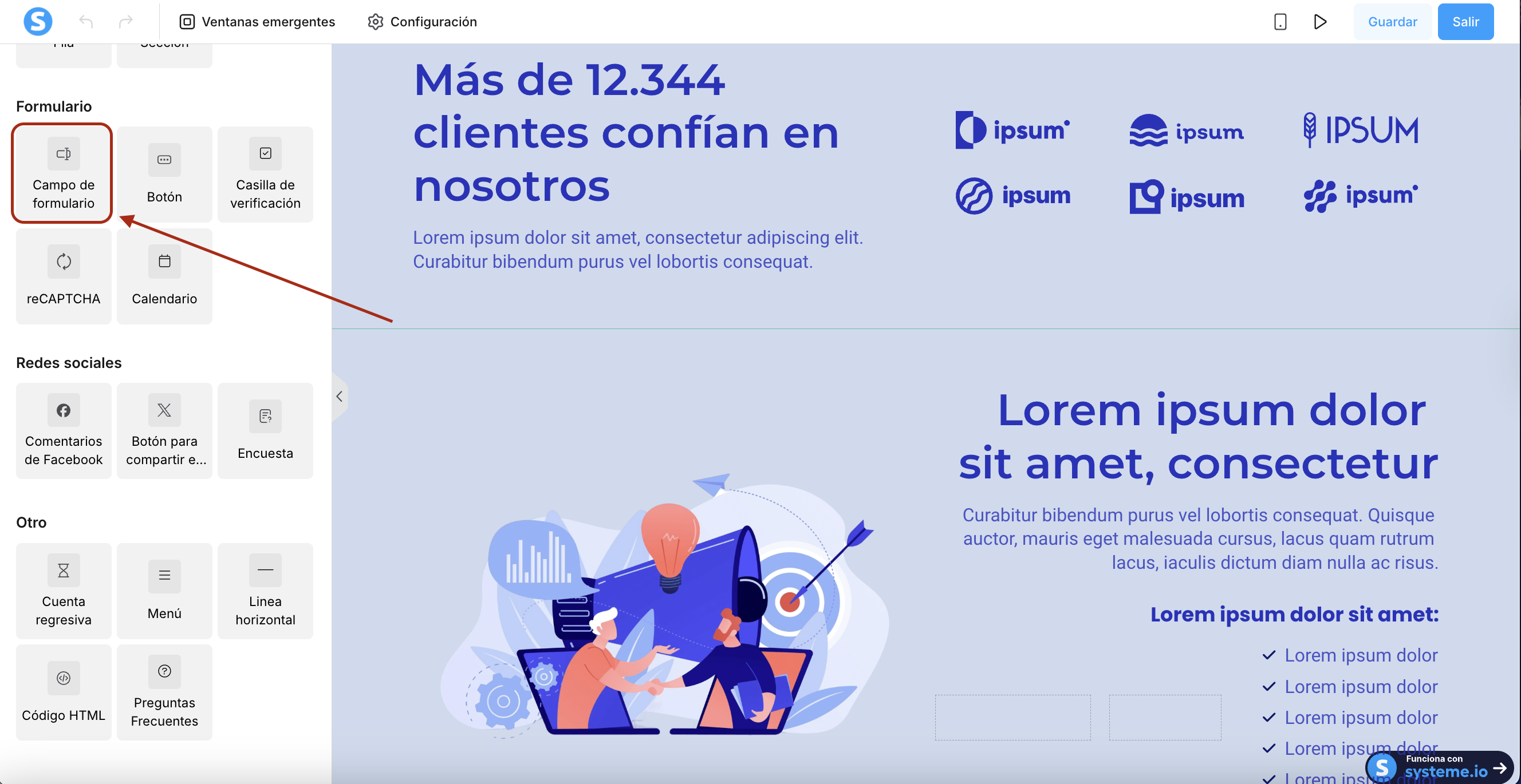 Encuentra el elemento Campo de formulario en la sección Formulario de la barra lateral y arrástralo y suéltalo en tu página: