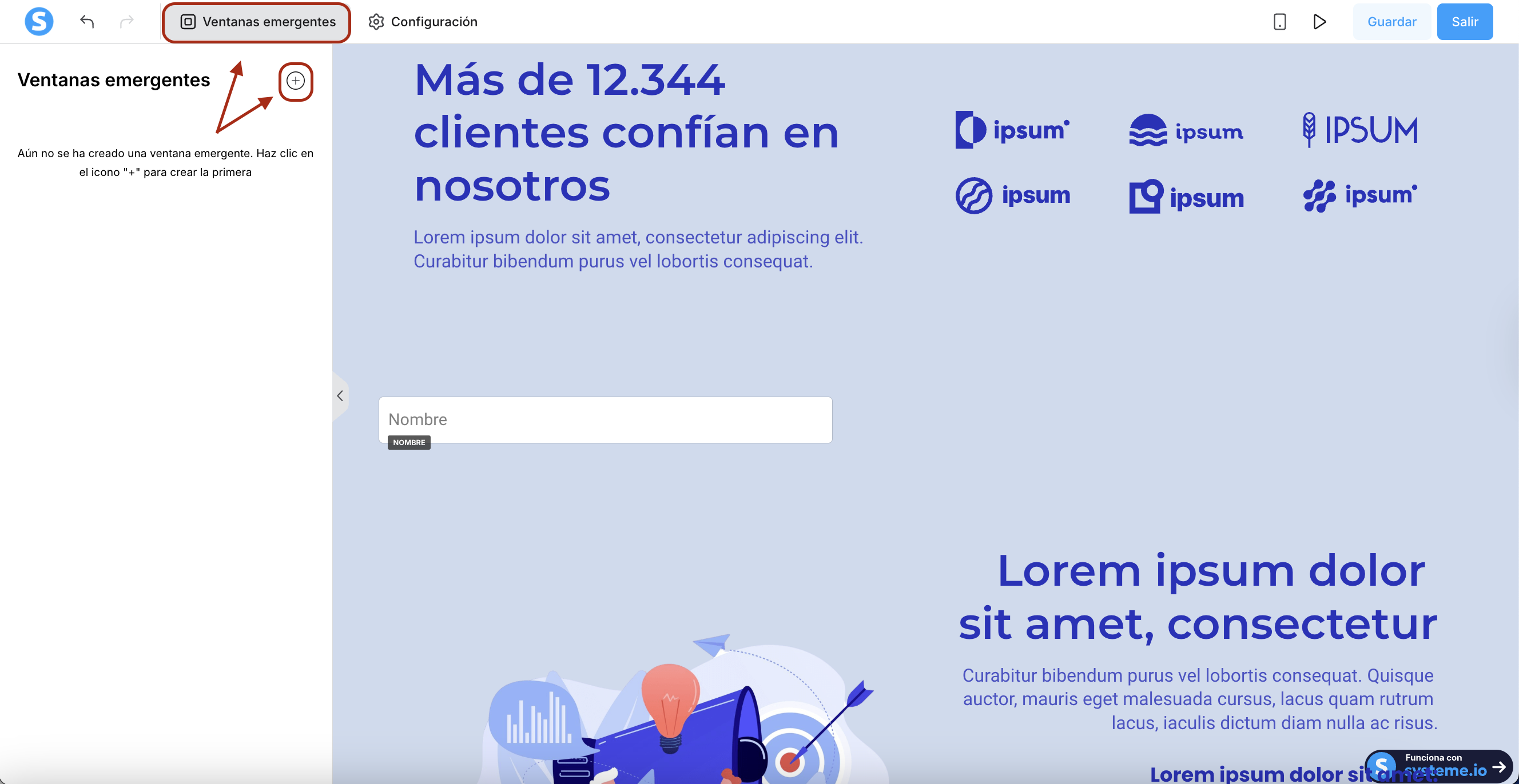 Para agregar una ventana emergente a tu página de registro, accede al editor y haz clic en Ventanas emergentes, luego en el icono del más (+):