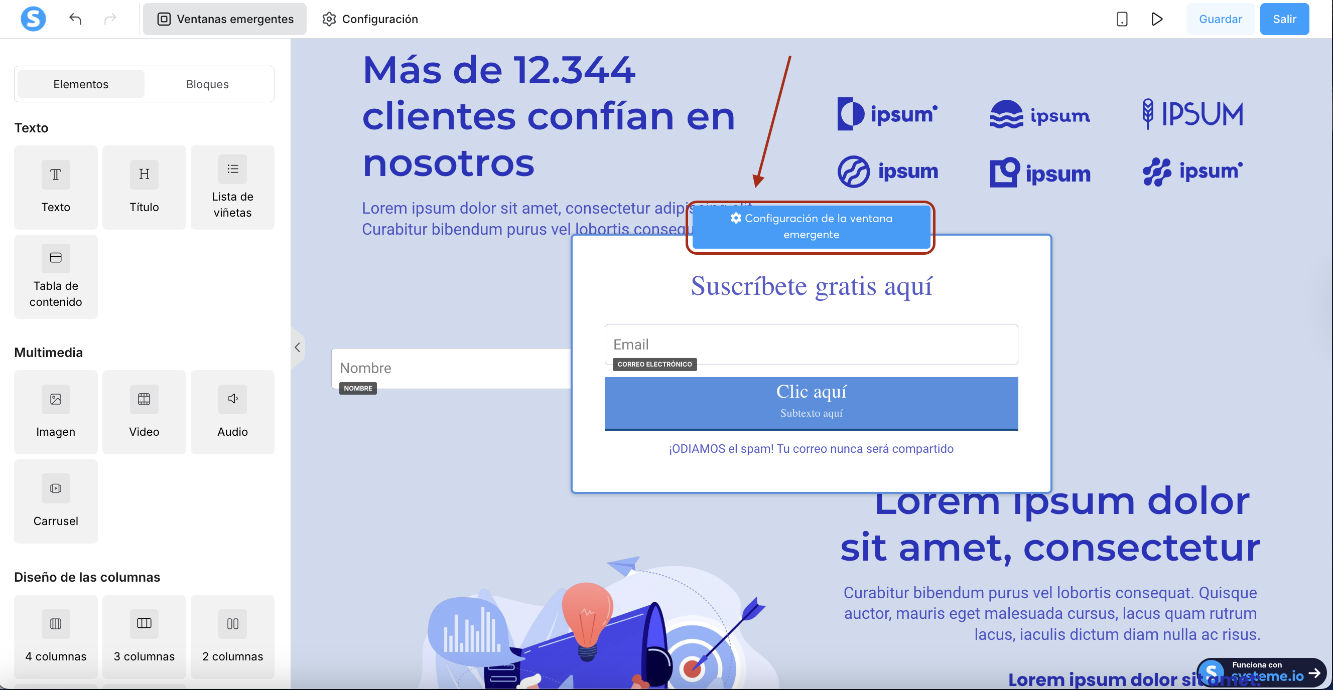La ventana emergente será añadida a tu página. Haz clic en el botón Editar la configuración de la ventana emergente: