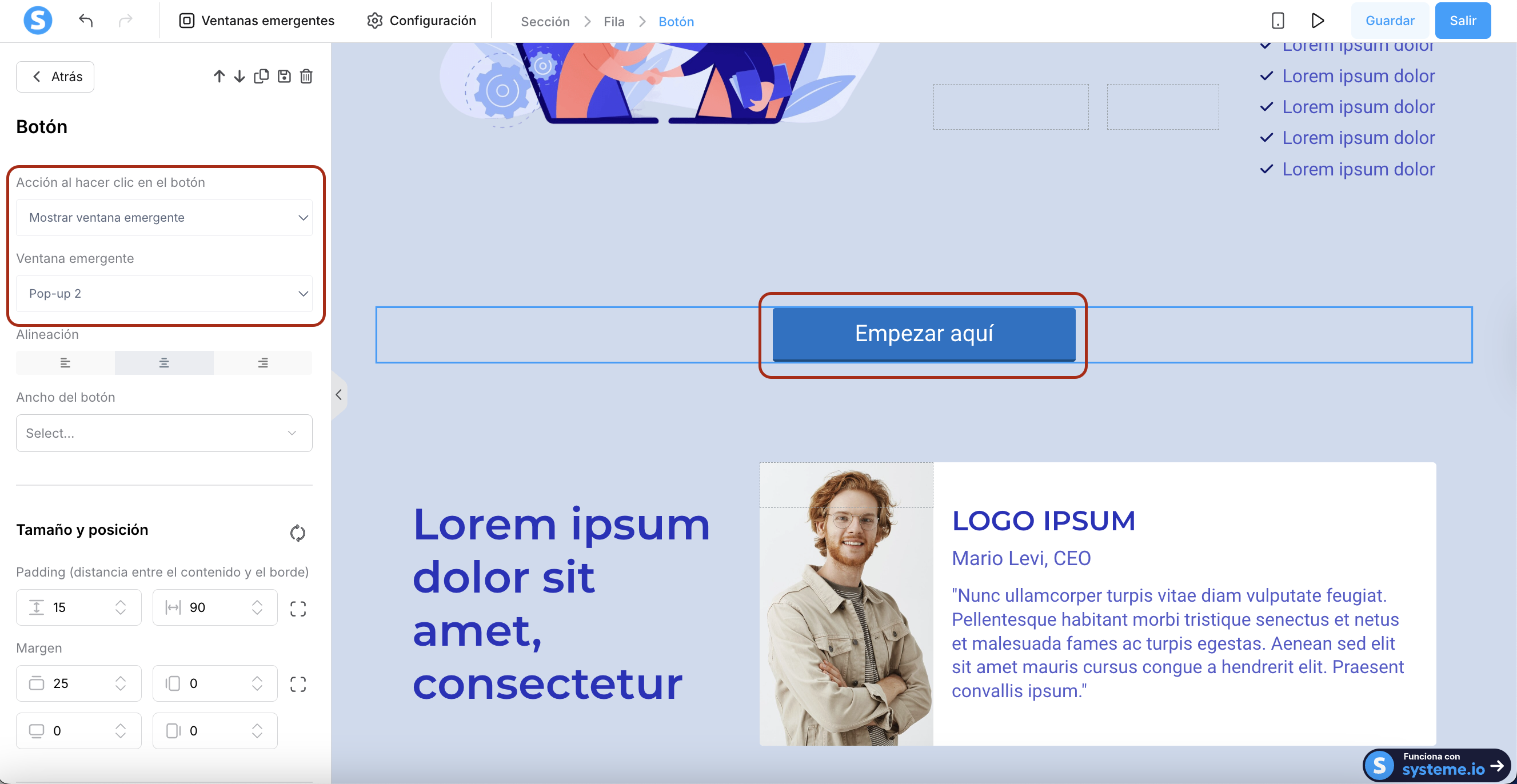 Para mostrar la ventana emergente al hacer clic en un botón, abre la configuración del botón y configúralo así: