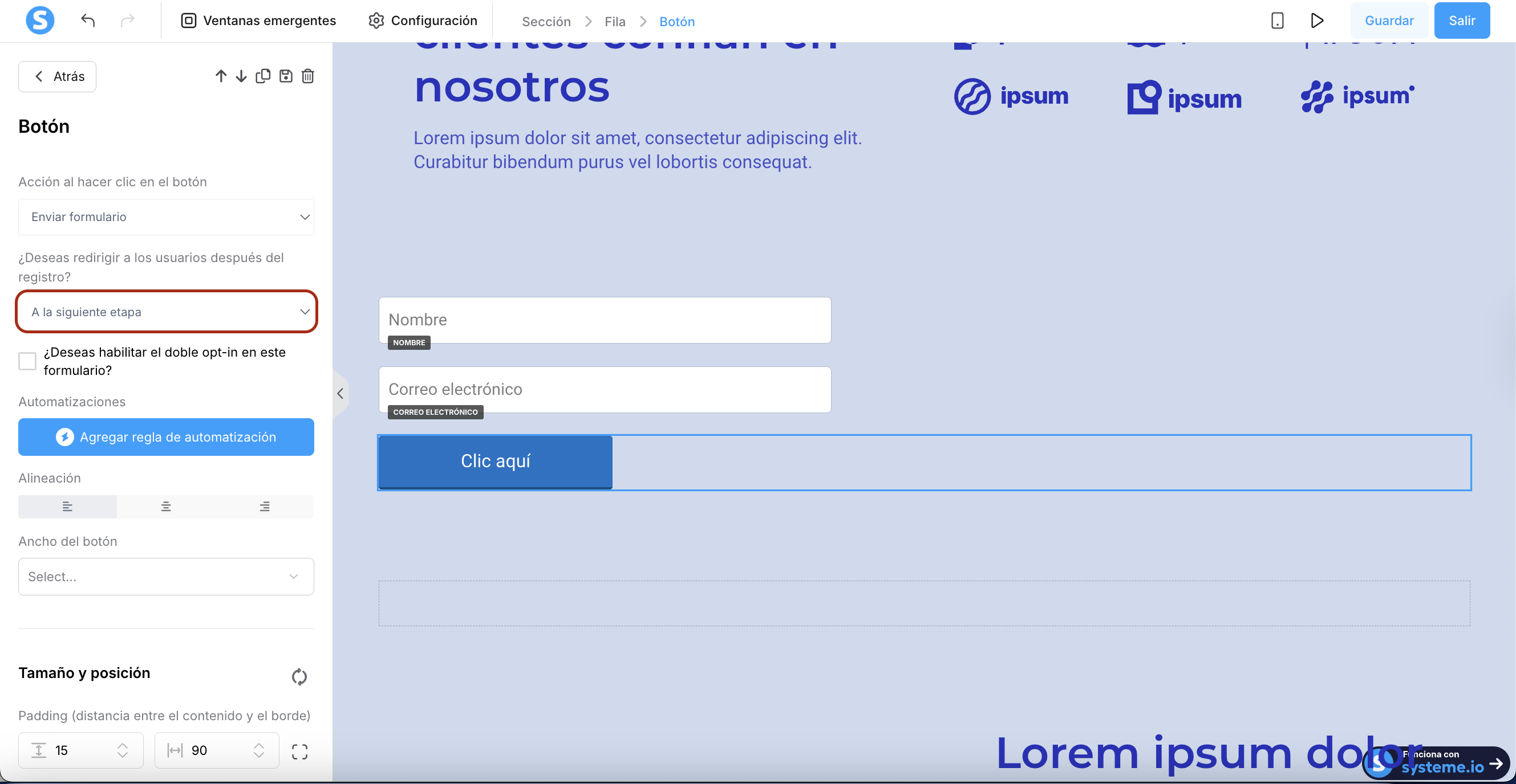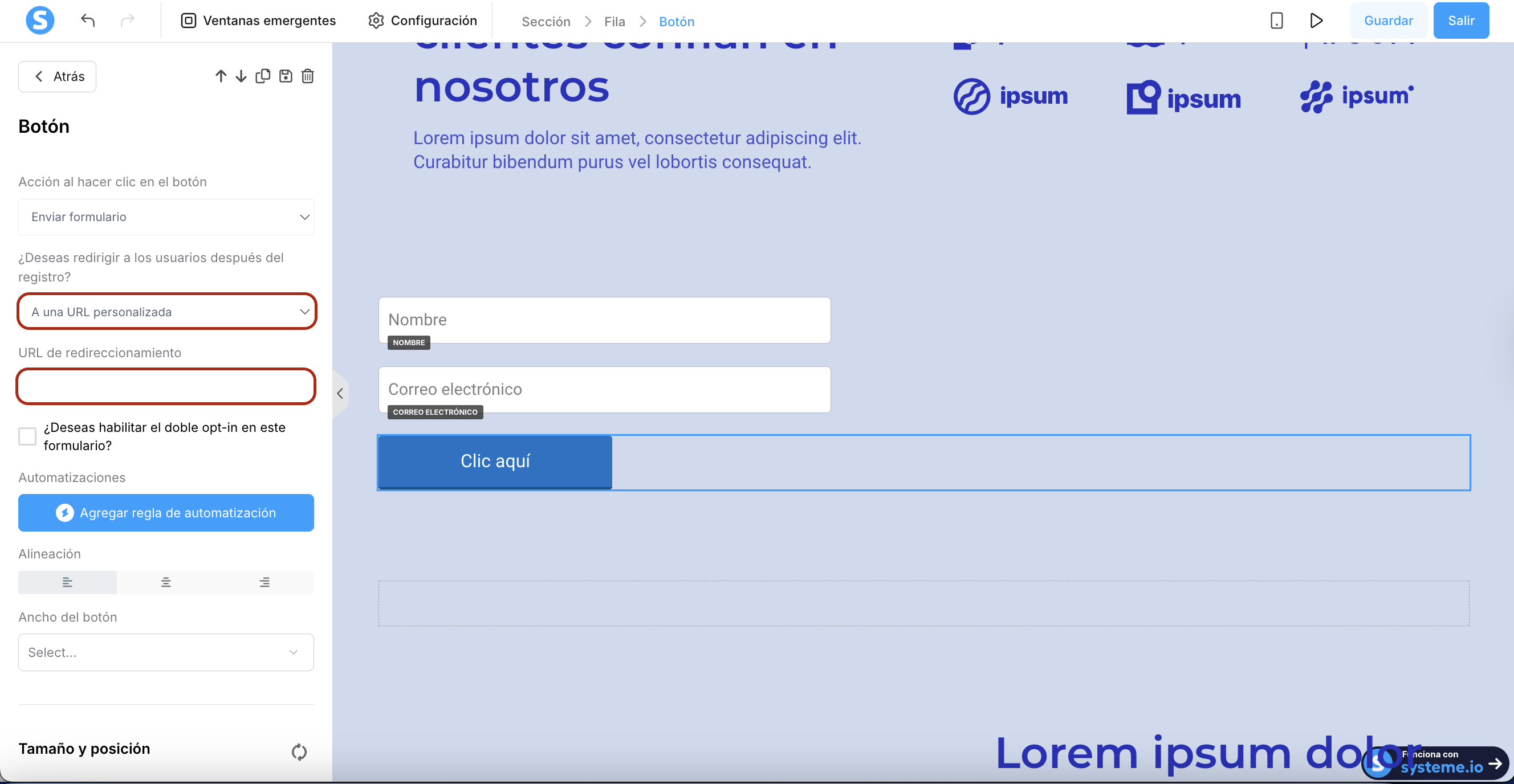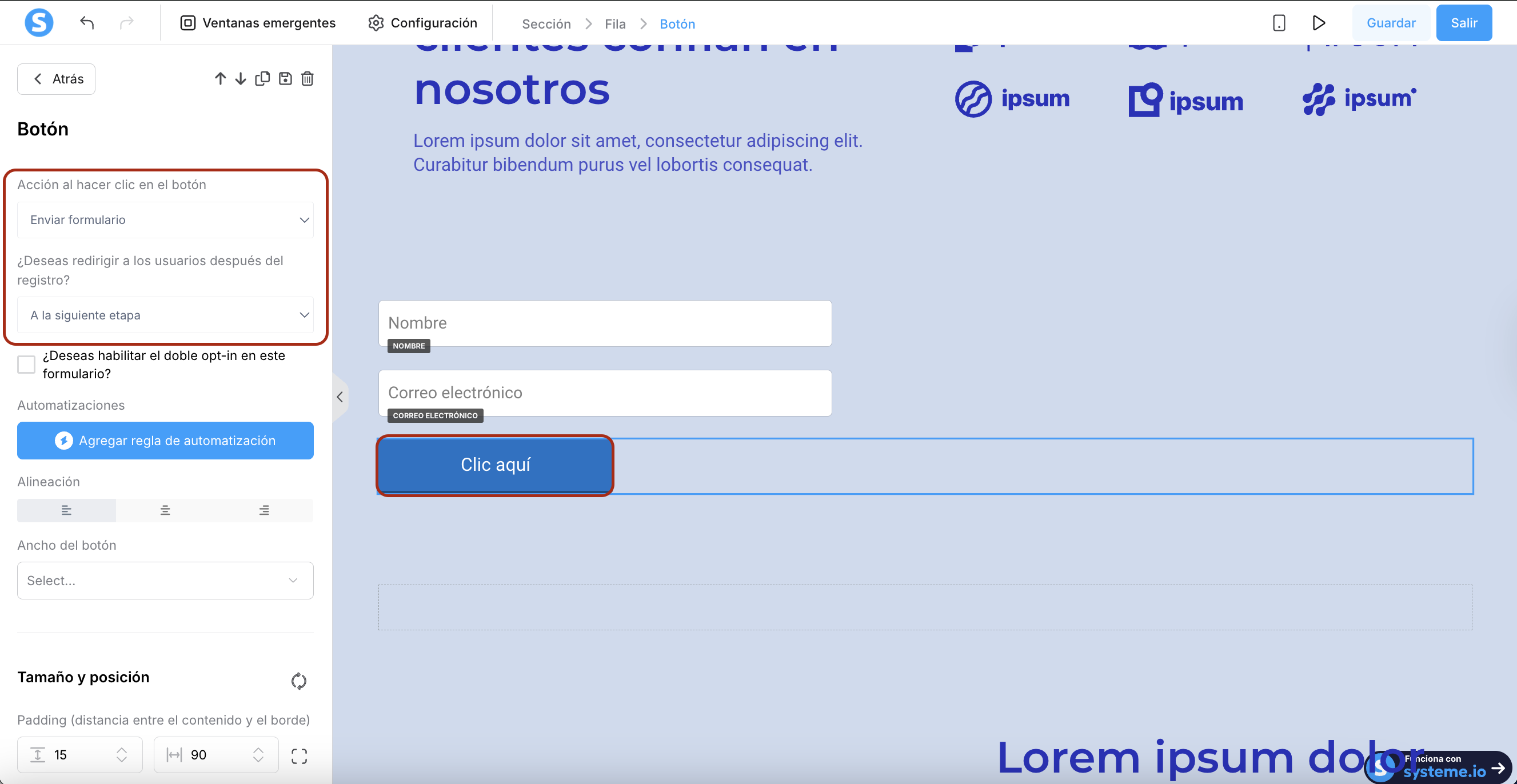 La opción Acción al hacer clic en el botón siempre debe estar establecida como Enviar formulario, para capturar con éxito los leads en la lista de contactos de tu cuenta.