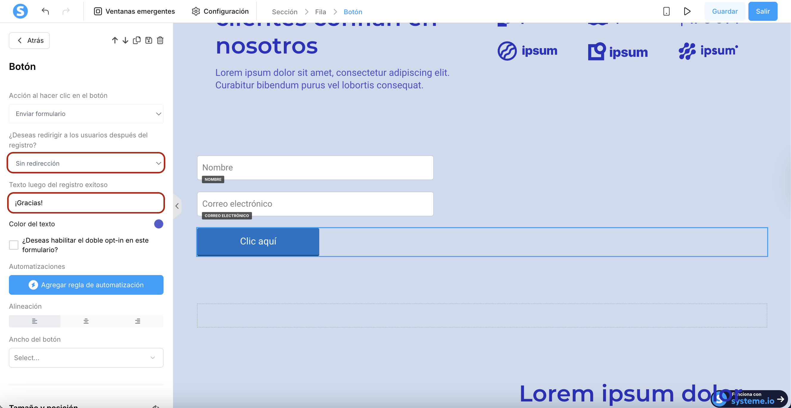 3. Sin redirección: el lead permanecerá en la página y puedes escribir un texto que aparecerá luego del registro.
