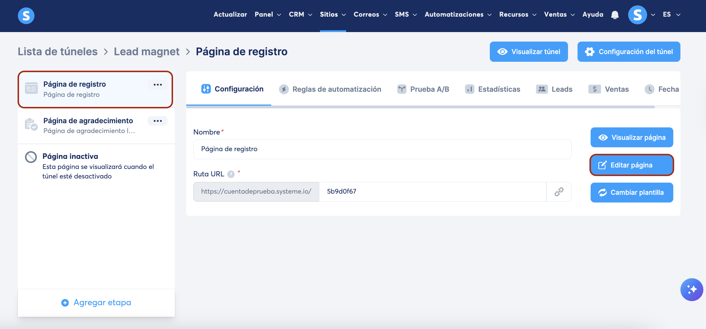 Abre el editor de tu página de registro haciendo clic en el botón Editar página.