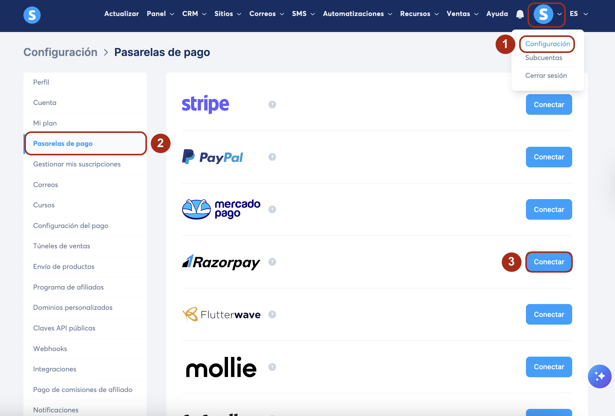 En el menú izquierdo de la página, haz clic en Pasarelas de pago (2) luego en Conectar (3).