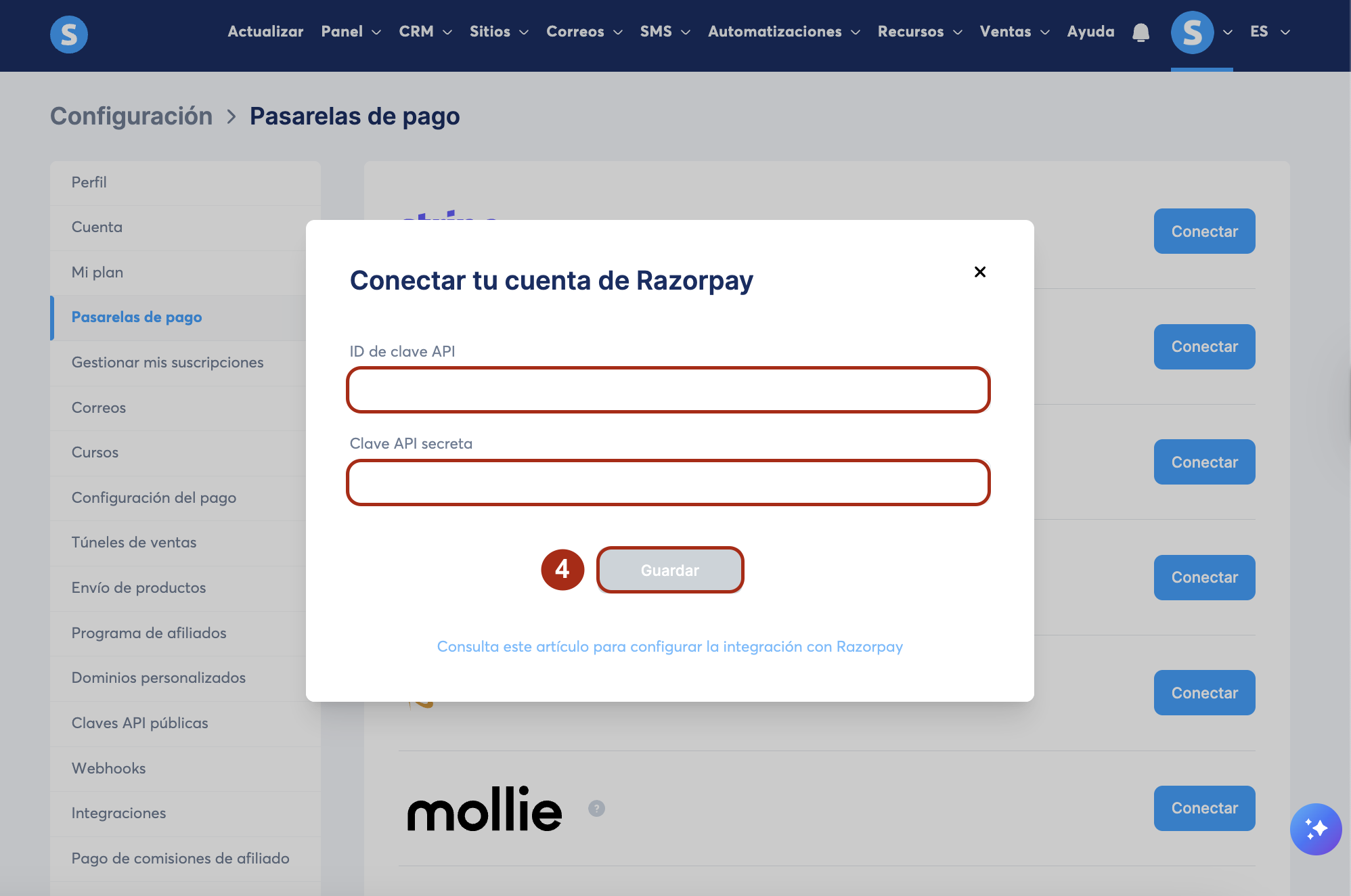 2. Ingresa tus credenciales de Razorpay a tu cuenta de systeme.io y haz clic en Guardar (4).