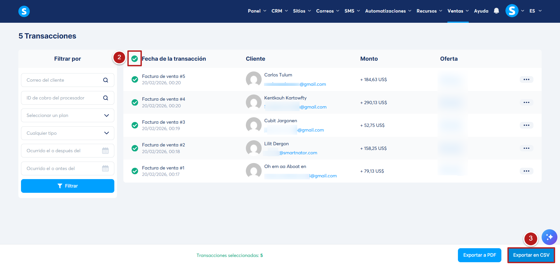 En la página Transacciones, selecciona las entradas específicas que deseas exportar, o selecciona todas (2), luego haz clic en Exportar a CSV (3).