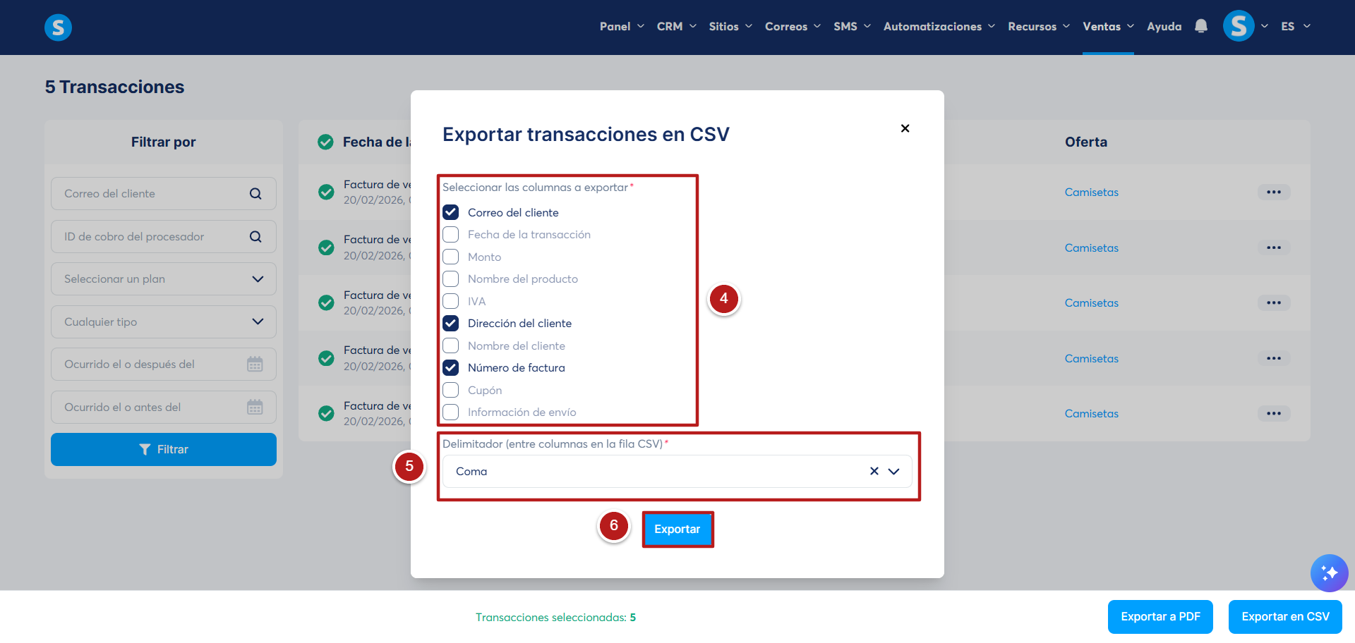 Selecciona un delimitador que se utilizará para separar las columnas en tu archivo CSV (5).