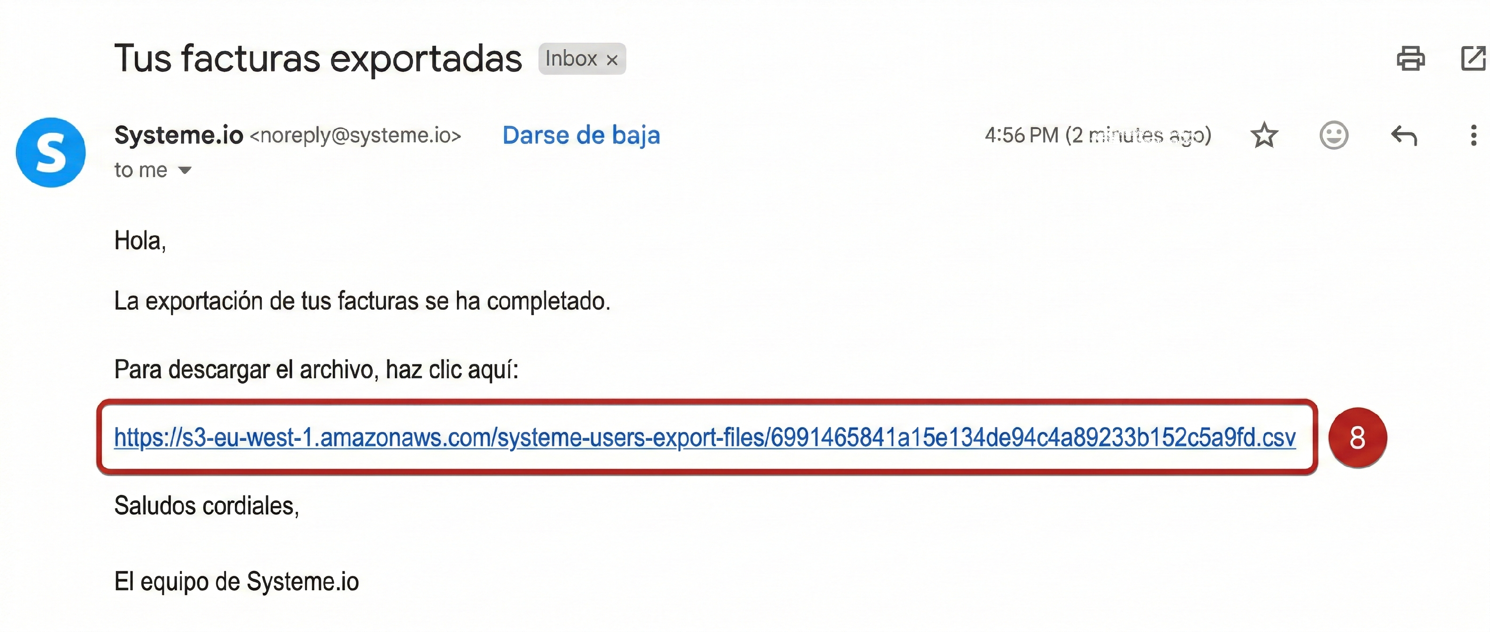 Para descargar el archivo, revisa la bandeja de entrada asociada a tu cuenta de systeme.io. El asunto del correo que recibirás será Tus facturas exportadas.