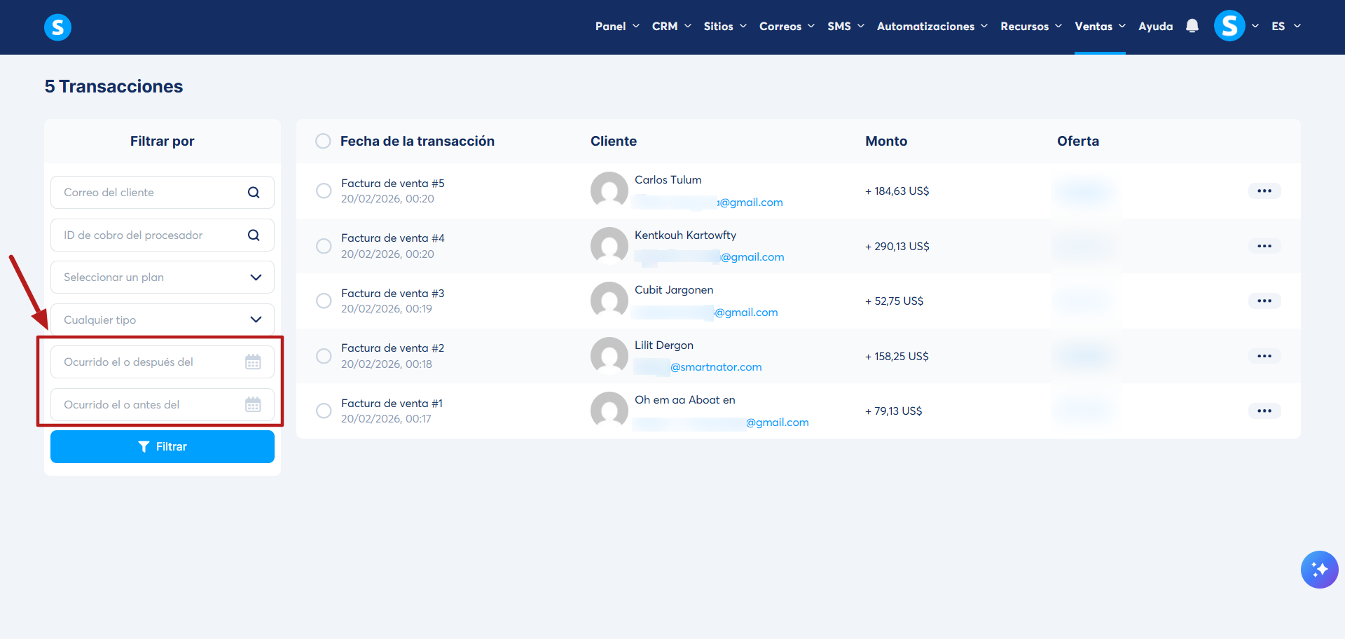 Nota: Antes de iniciar la exportación, también puedes filtrar las transacciones para mostrar únicamente las entradas que hayan ocurrido durante un período o intervalo específico.